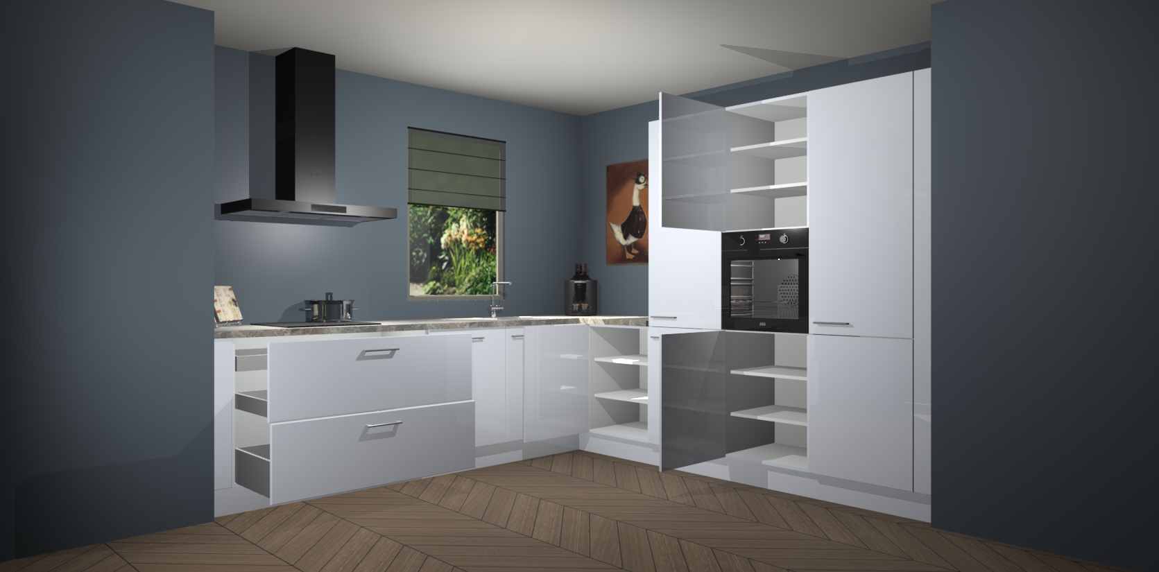 Welkom bij de Sneeuwwitte hoogglans keuken Laos. Deze prachtige keuken zal de komende jaren het middelpunt van de belangstelling in uw huis zijn. Uitgerust met vijf inbouwapparaten komt u nooit kookgereedschap tekort. Bovendien geeft de warme houtlook elke ruimte een uitnodigende en tijdloze uitstraling.