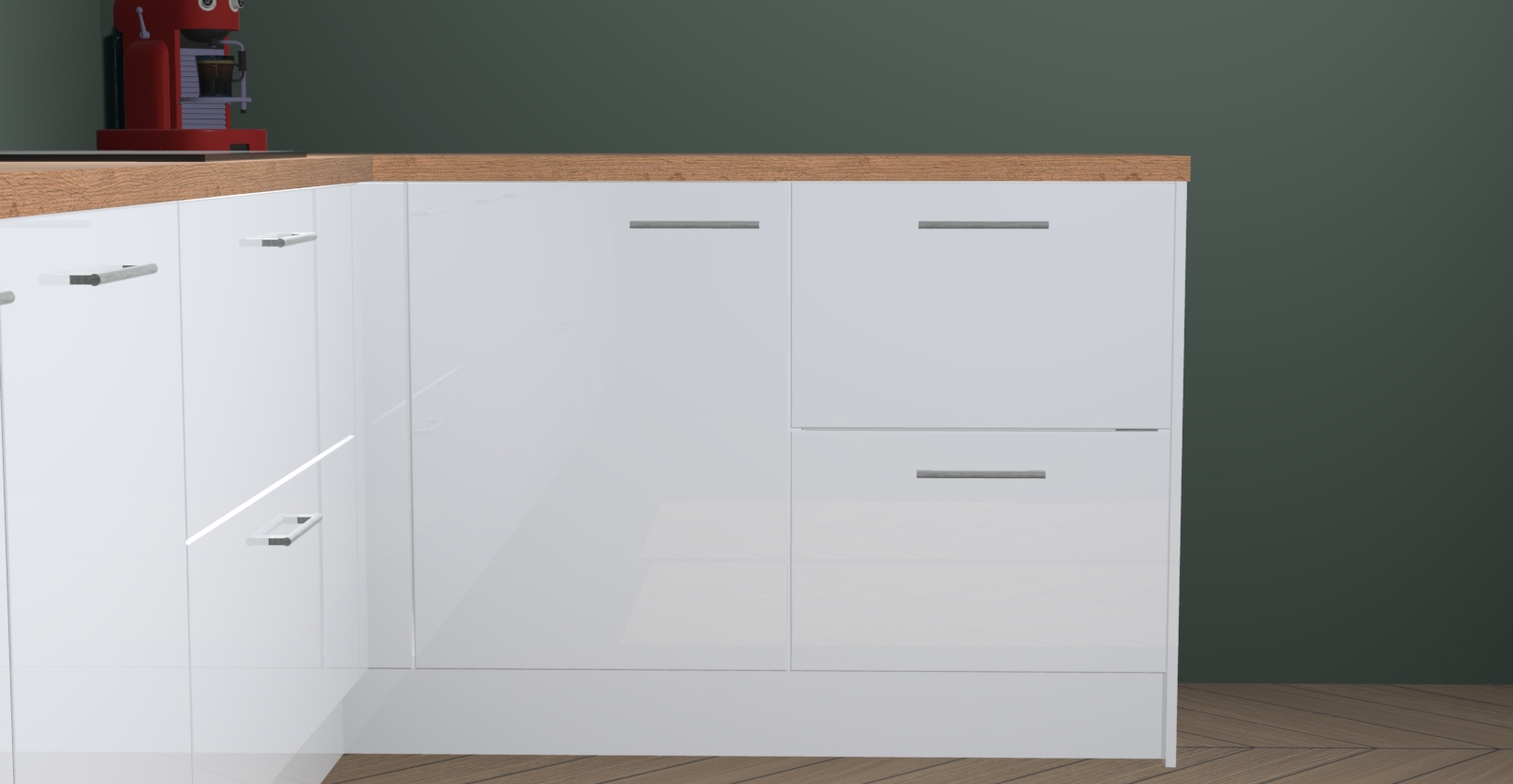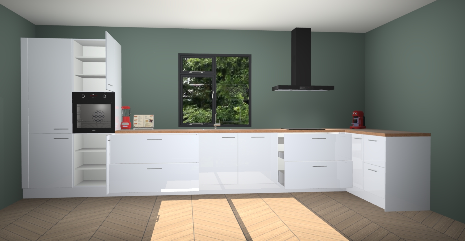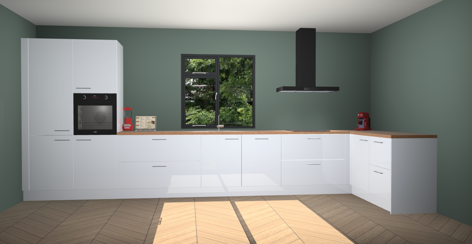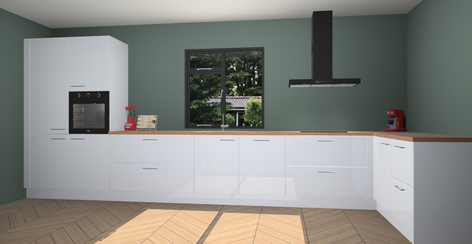 De Sneeuwwitte hoogglans keuken Lille wordt geleverd met vijf inbouwapparaten - een oven, inductiekookplaat, afzuigkap, vaatwasser en koelkast. Maar dat is nog niet alles! Na bestelling kunnen deze apparaten eenvoudig worden geüpgraded naar premium AEG-apparatuur. Bovendien is er zelfs de optie om de oven te vervangen door een combimagnetron of uw inductiekookplaat te vervangen door een kookplaat met geïntegreerde afzuiging.