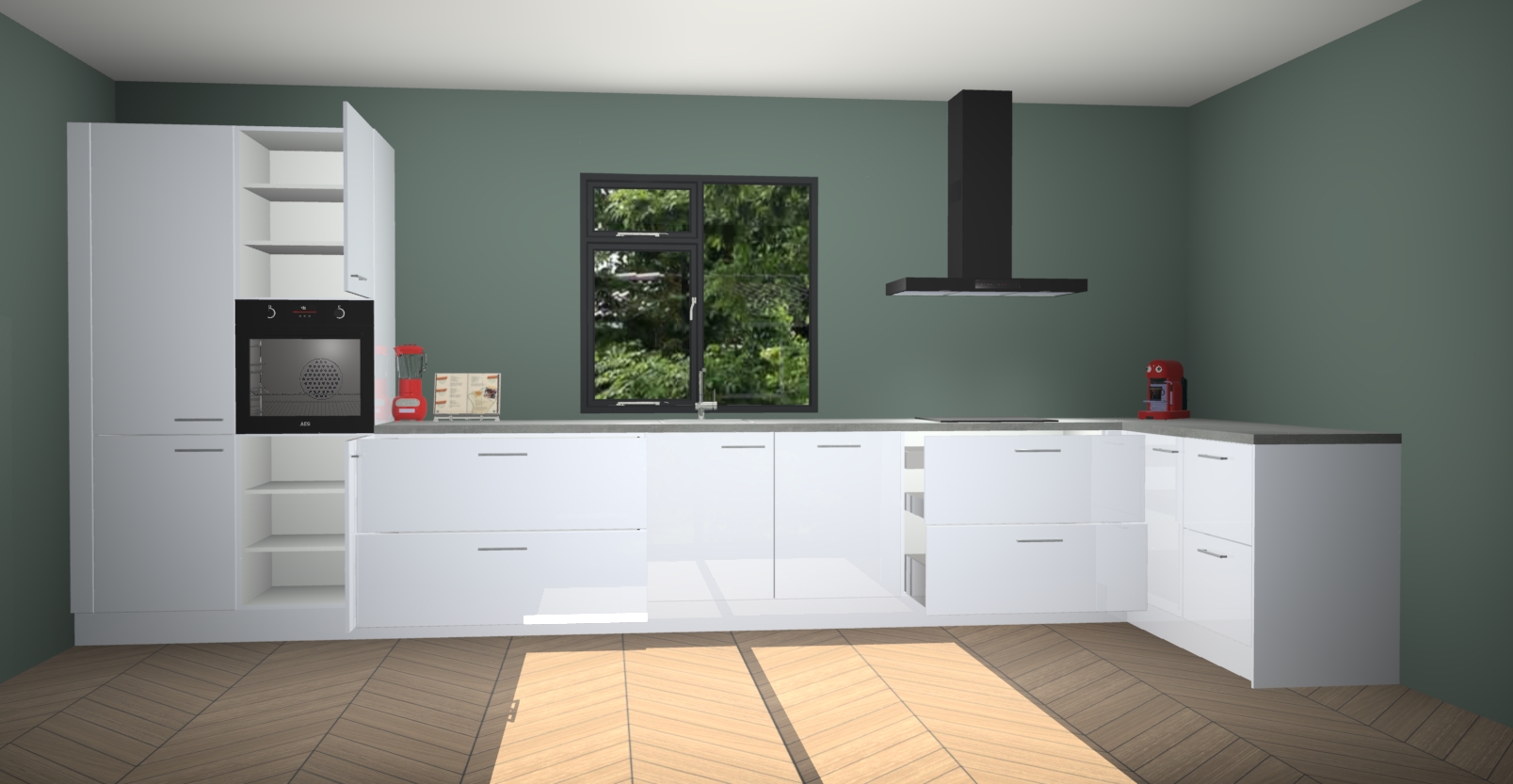 De Sneeuwwitte hoogglans keuken Lille wordt geleverd met vijf inbouwapparaten - een oven, inductiekookplaat, afzuigkap, vaatwasser en koelkast. Maar dat is nog niet alles! Na bestelling kunnen deze apparaten eenvoudig worden geüpgraded naar premium AEG-apparatuur. Bovendien is er zelfs de optie om de oven te vervangen door een combimagnetron of uw inductiekookplaat te vervangen door een kookplaat met geïntegreerde afzuiging.