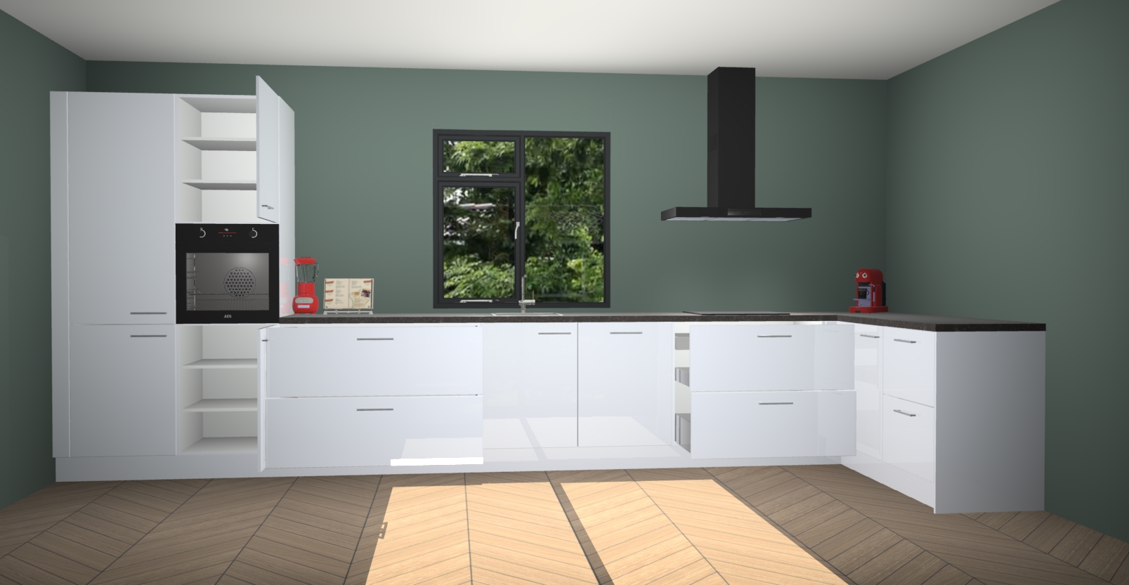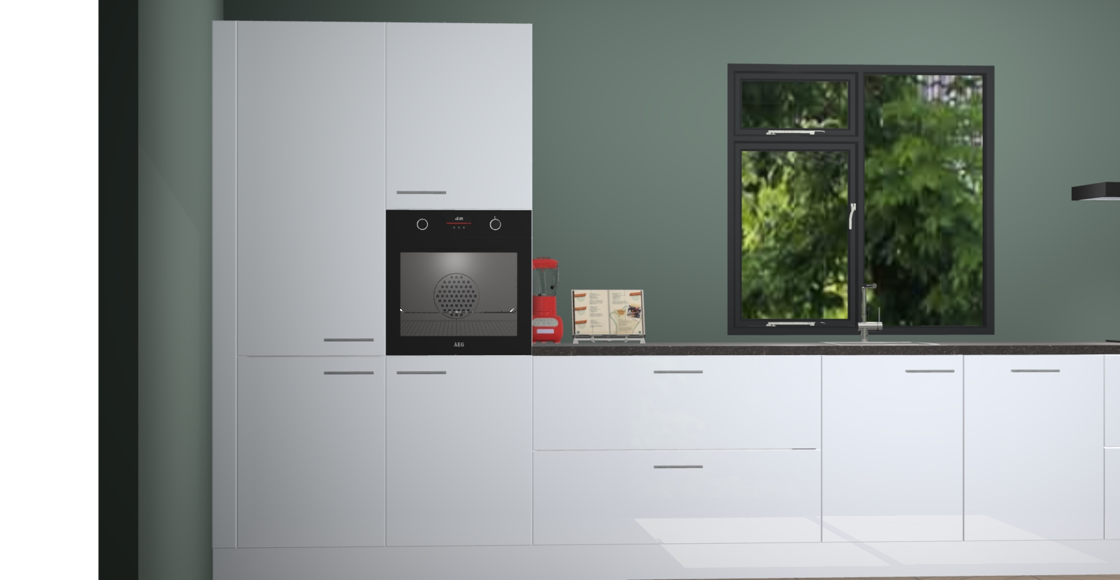 De Sneeuwwitte hoogglans keuken Lille wordt geleverd met vijf inbouwapparaten - een oven, inductiekookplaat, afzuigkap, vaatwasser en koelkast. Maar dat is nog niet alles! Na bestelling kunnen deze apparaten eenvoudig worden geüpgraded naar premium AEG-apparatuur. Bovendien is er zelfs de optie om de oven te vervangen door een combimagnetron of uw inductiekookplaat te vervangen door een kookplaat met geïntegreerde afzuiging.