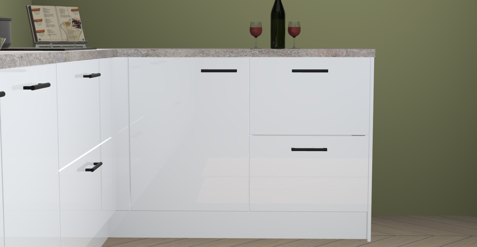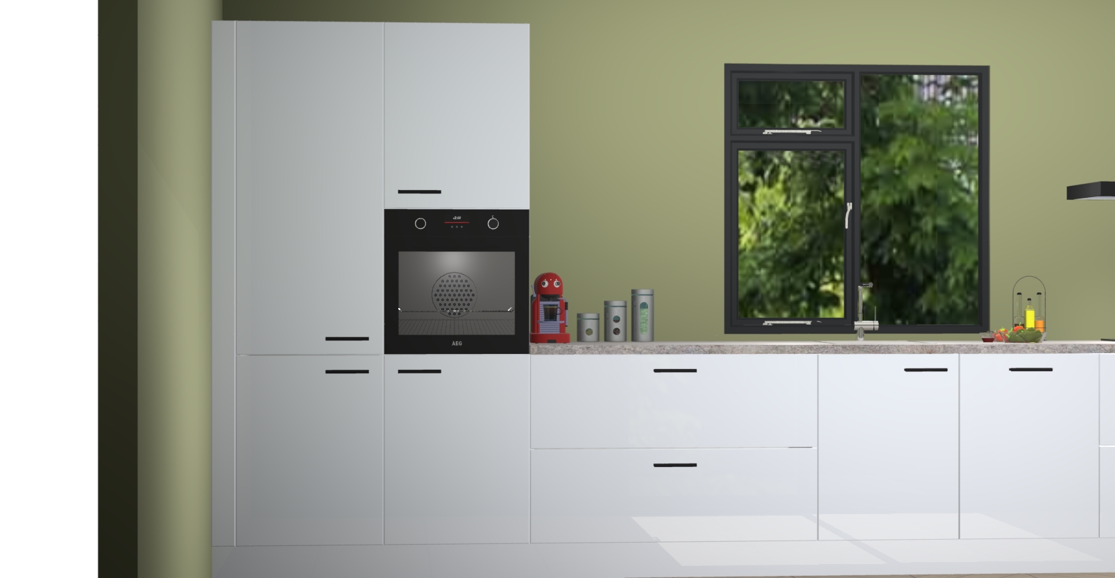 De Sneeuwwitte hoogglans keuken Lille wordt geleverd met vijf inbouwapparaten - een oven, inductiekookplaat, afzuigkap, vaatwasser en koelkast. Maar dat is nog niet alles! Na bestelling kunnen deze apparaten eenvoudig worden geüpgraded naar premium AEG-apparatuur. Bovendien is er zelfs de optie om de oven te vervangen door een combimagnetron of uw inductiekookplaat te vervangen door een kookplaat met geïntegreerde afzuiging.