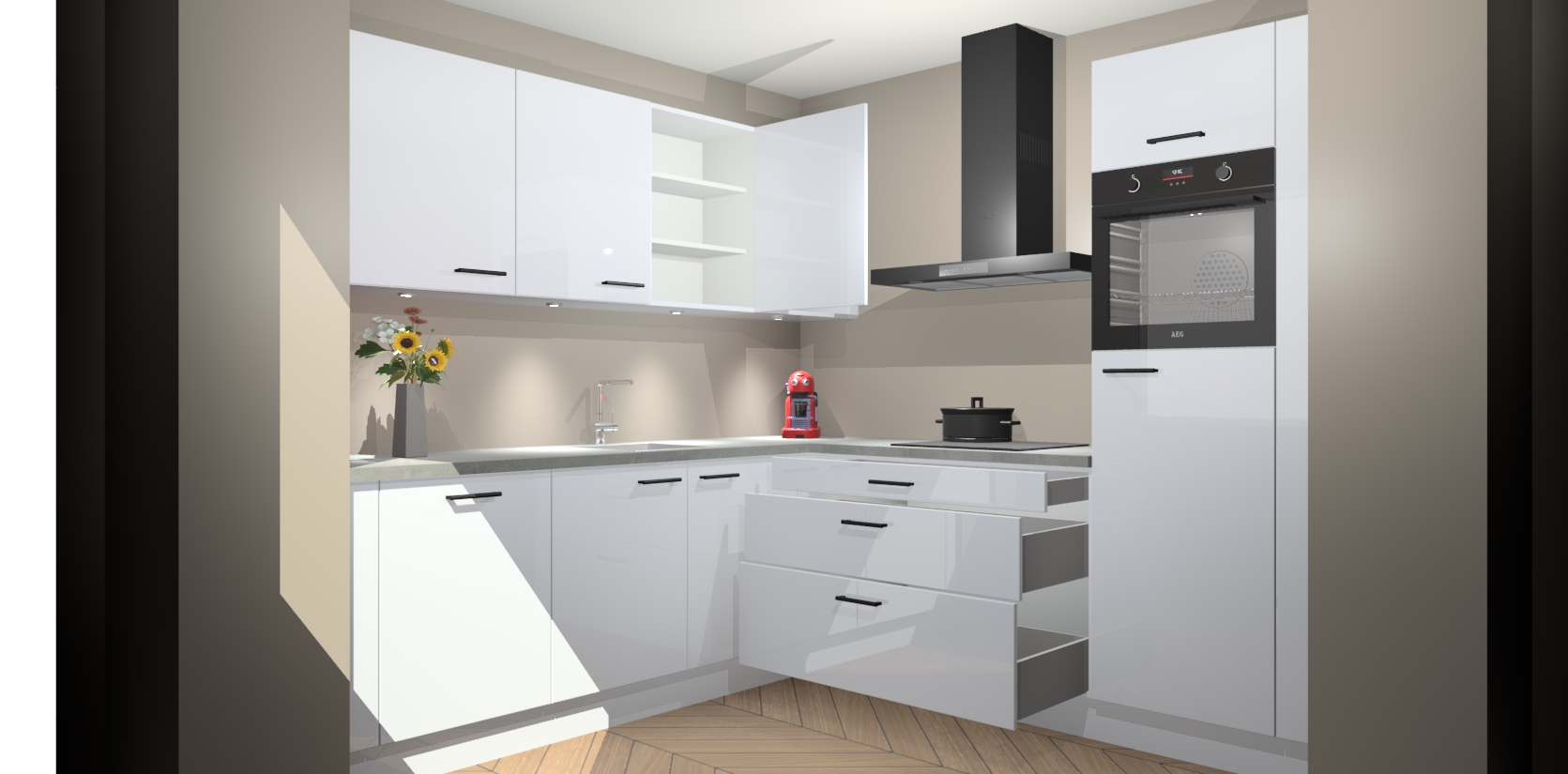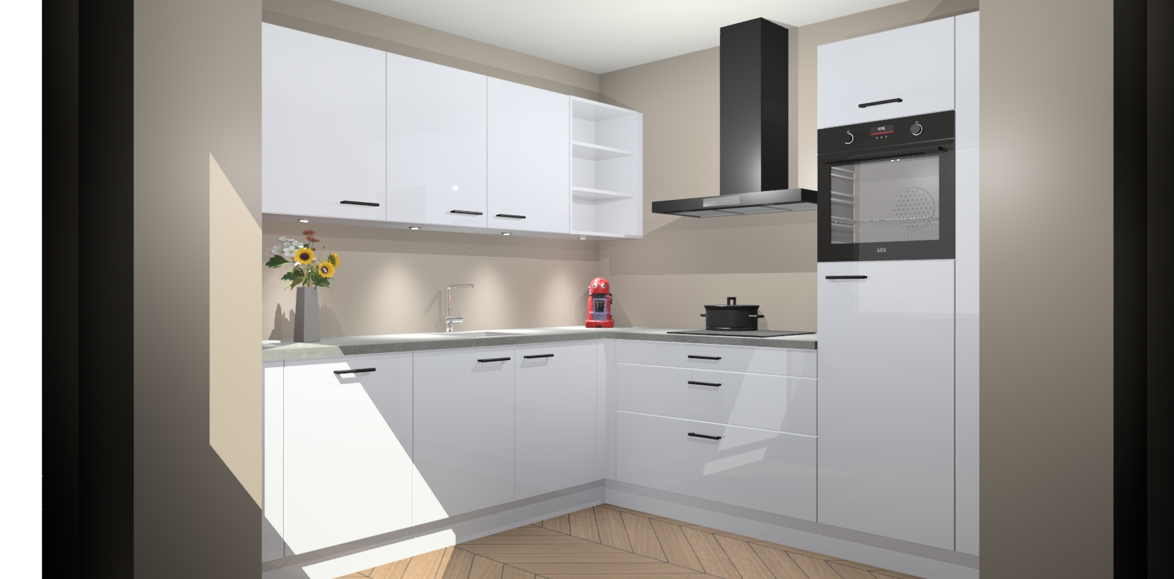 Met een modern, tijdloos design en ruime opslagruimte, zult u zich in no-time thuis voelen in uw nieuwe keuken. Uw leven wordt eenvoudiger met de soft-close deuren die voor het ultieme stille comfort zorgen - geen geluid dat u stoort terwijl u kookt. Ook is de keuken voorzien van 5 ingebouwde apparaten: een oven, inductie kookplaat, afzuigkap, vaatwasser en koelkast. Deze kunnen gemakkelijk na bestelling worden bijgewerkt naar AEG - waardoor uw luxe ervaring compleet is.