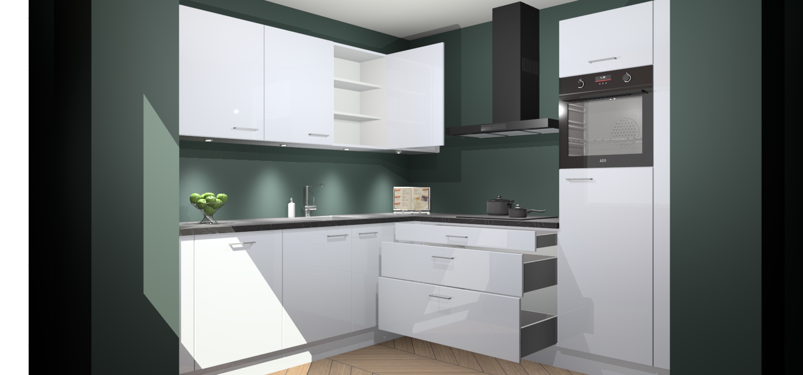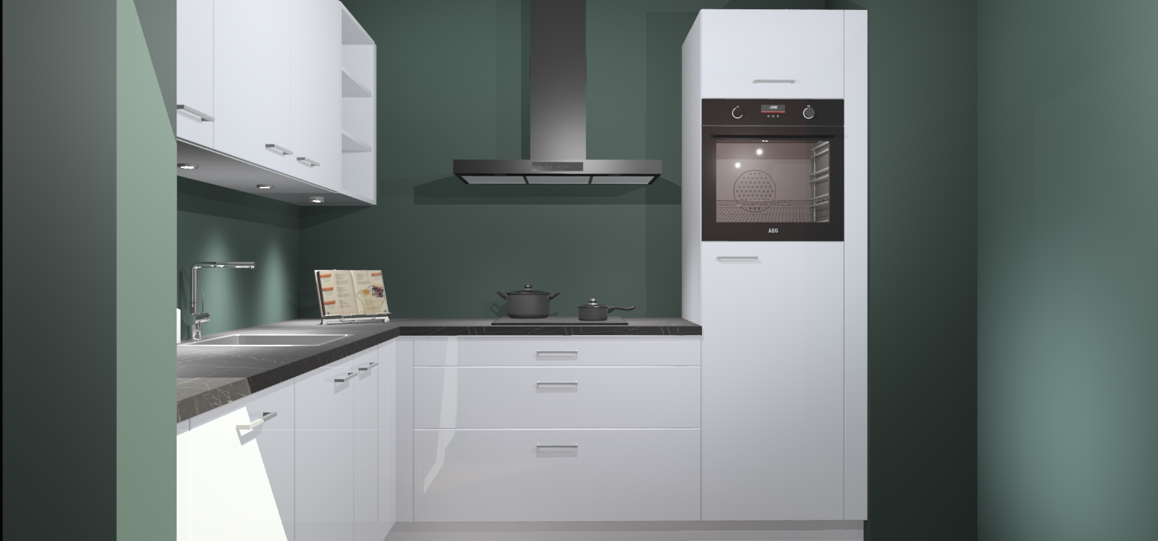 Met een modern, tijdloos design en ruime opslagruimte, zult u zich in no-time thuis voelen in uw nieuwe keuken. Uw leven wordt eenvoudiger met de soft-close deuren die voor het ultieme stille comfort zorgen - geen geluid dat u stoort terwijl u kookt. Ook is de keuken voorzien van 5 ingebouwde apparaten: een oven, inductie kookplaat, afzuigkap, vaatwasser en koelkast. Deze kunnen gemakkelijk na bestelling worden bijgewerkt naar AEG - waardoor uw luxe ervaring compleet is.