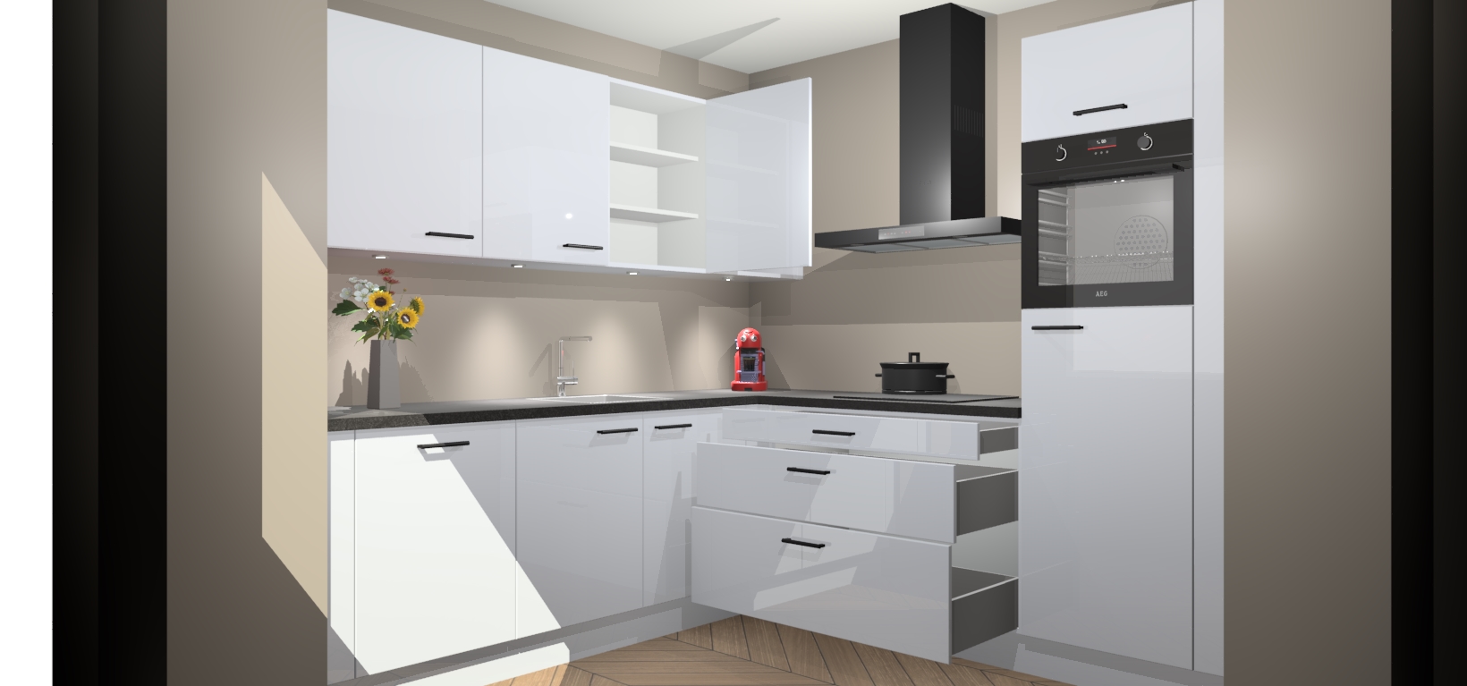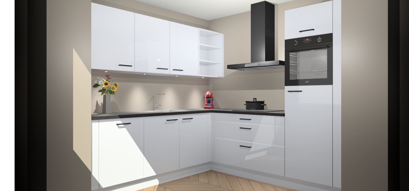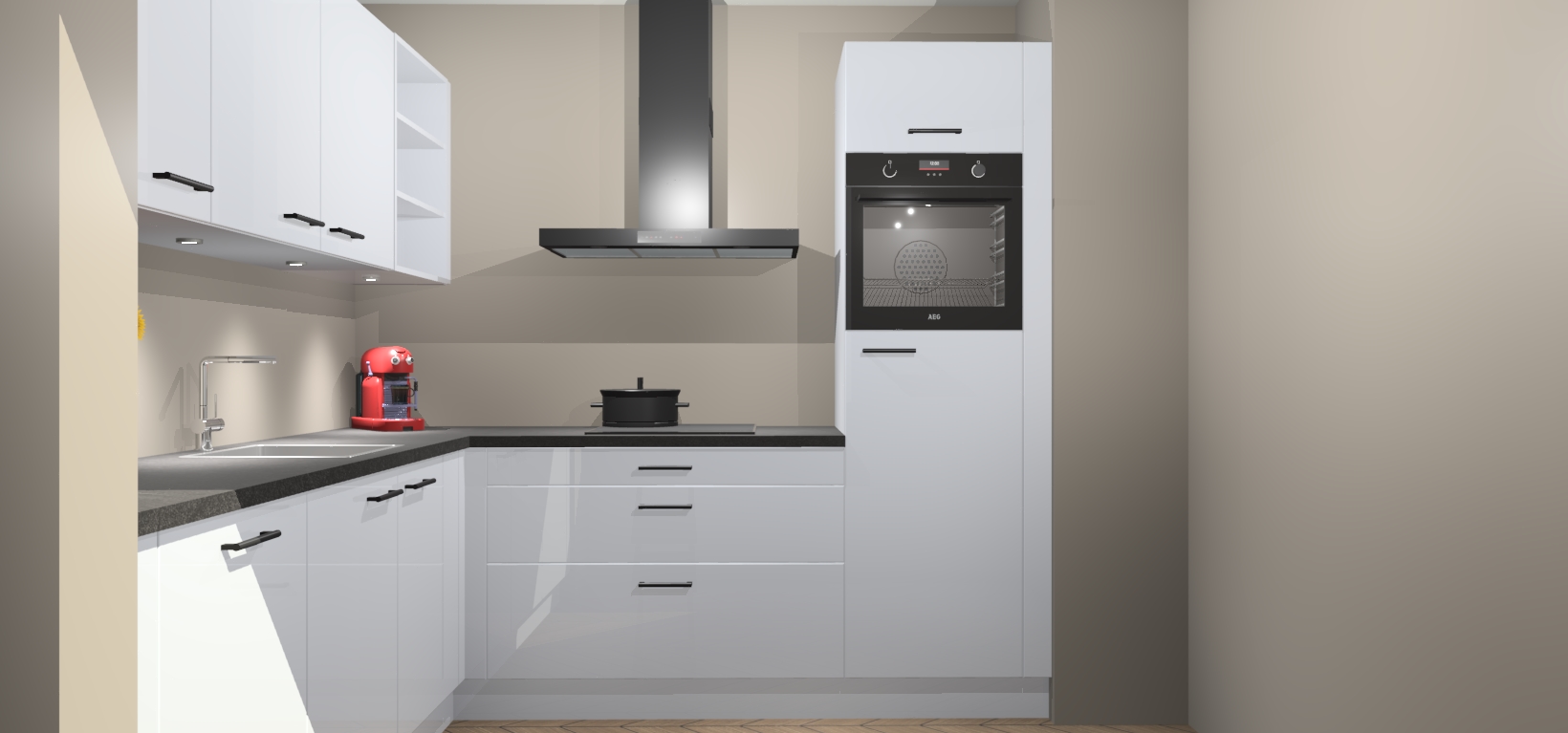 Met een modern, tijdloos design en ruime opslagruimte, zult u zich in no-time thuis voelen in uw nieuwe keuken. Uw leven wordt eenvoudiger met de soft-close deuren die voor het ultieme stille comfort zorgen - geen geluid dat u stoort terwijl u kookt. Ook is de keuken voorzien van 5 ingebouwde apparaten: een oven, inductie kookplaat, afzuigkap, vaatwasser en koelkast. Deze kunnen gemakkelijk na bestelling worden bijgewerkt naar AEG - waardoor uw luxe ervaring compleet is.