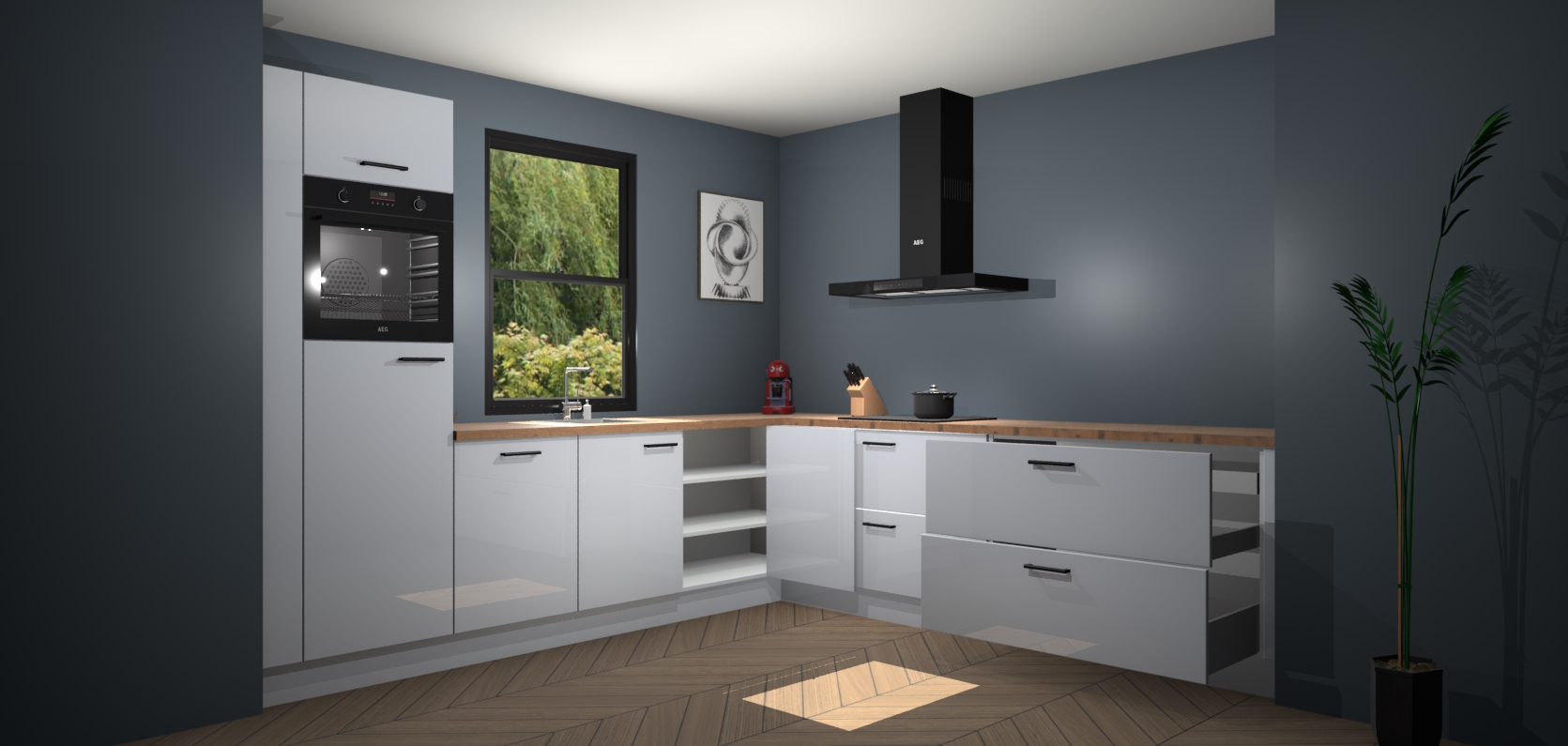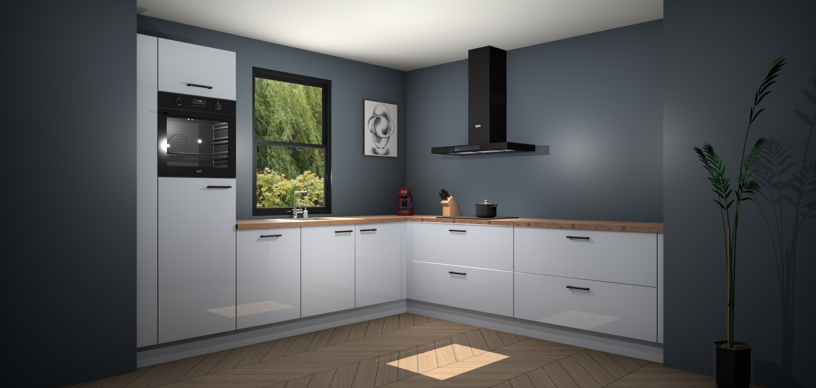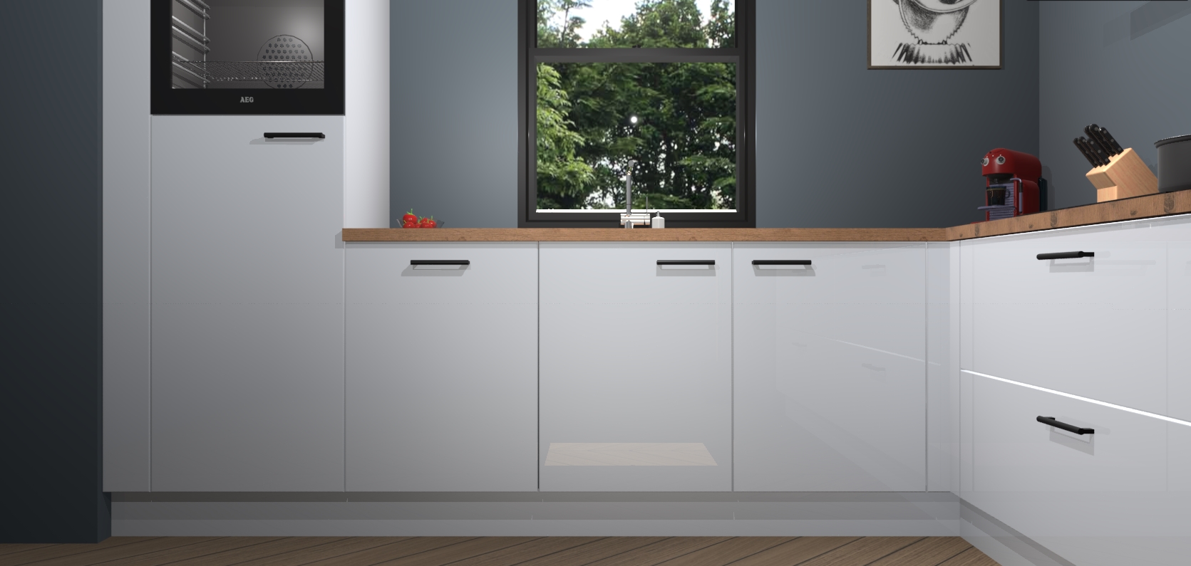Welkom bij de sneeuwwitte hoogglans keuken Lublin. Deze prachtige keuken zal de komende jaren het middelpunt van de belangstelling in uw huis zijn. Uitgerust met vijf inbouwapparaten komt u nooit kookgereedschap tekort. Bovendien geeft de warme houtlook elke ruimte een uitnodigende en tijdloze uitstraling.