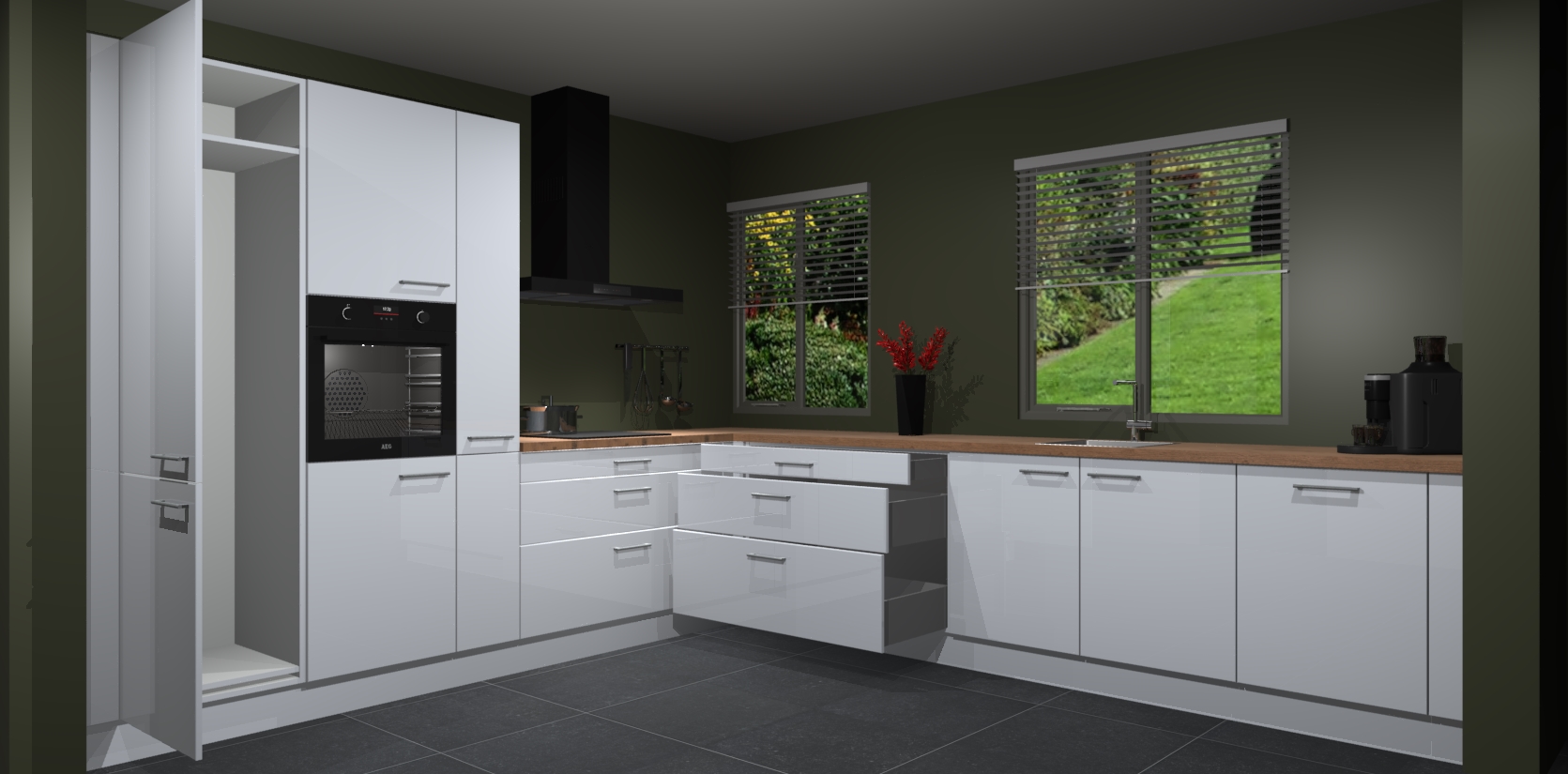 Welkom bij de Sneeuwwitte hoogglans keuken Palermo. Deze prachtige keuken zal de komende jaren het middelpunt van de belangstelling in uw huis zijn. Uitgerust met vijf inbouwapparaten komt u nooit kookgereedschap tekort. Bovendien geeft de warme houtlook elke ruimte een uitnodigende en tijdloze uitstraling.
