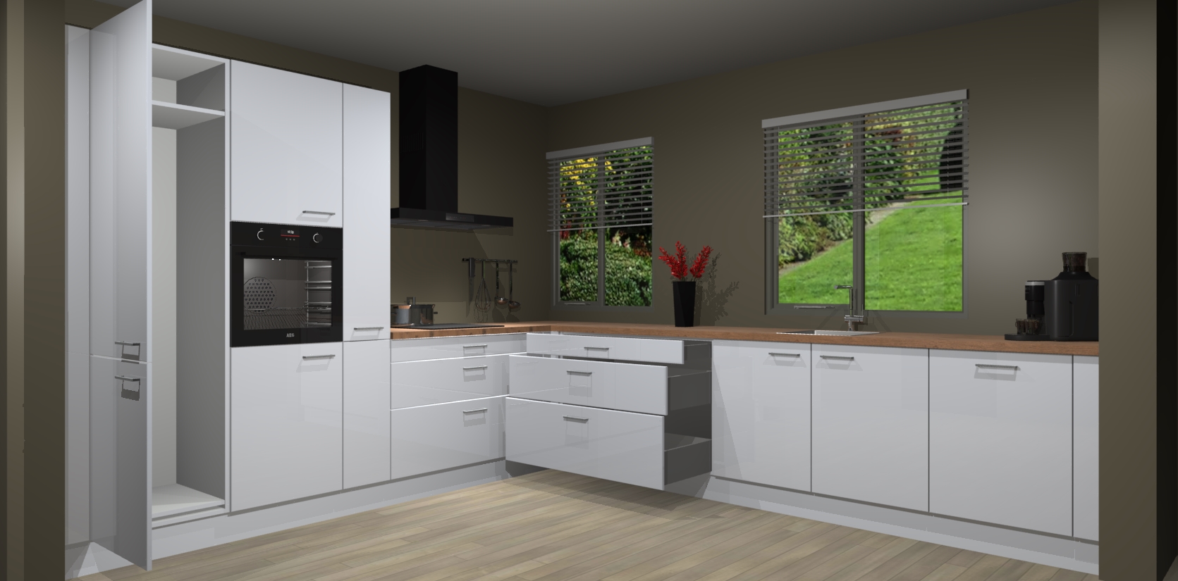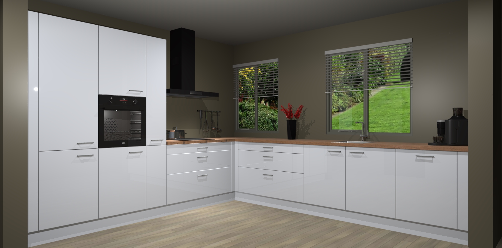 Welkom bij de Sneeuwwitte hoogglans keuken Palermo. Deze prachtige keuken zal de komende jaren het middelpunt van de belangstelling in uw huis zijn. Uitgerust met vijf inbouwapparaten komt u nooit kookgereedschap tekort. Bovendien geeft de warme houtlook elke ruimte een uitnodigende en tijdloze uitstraling.