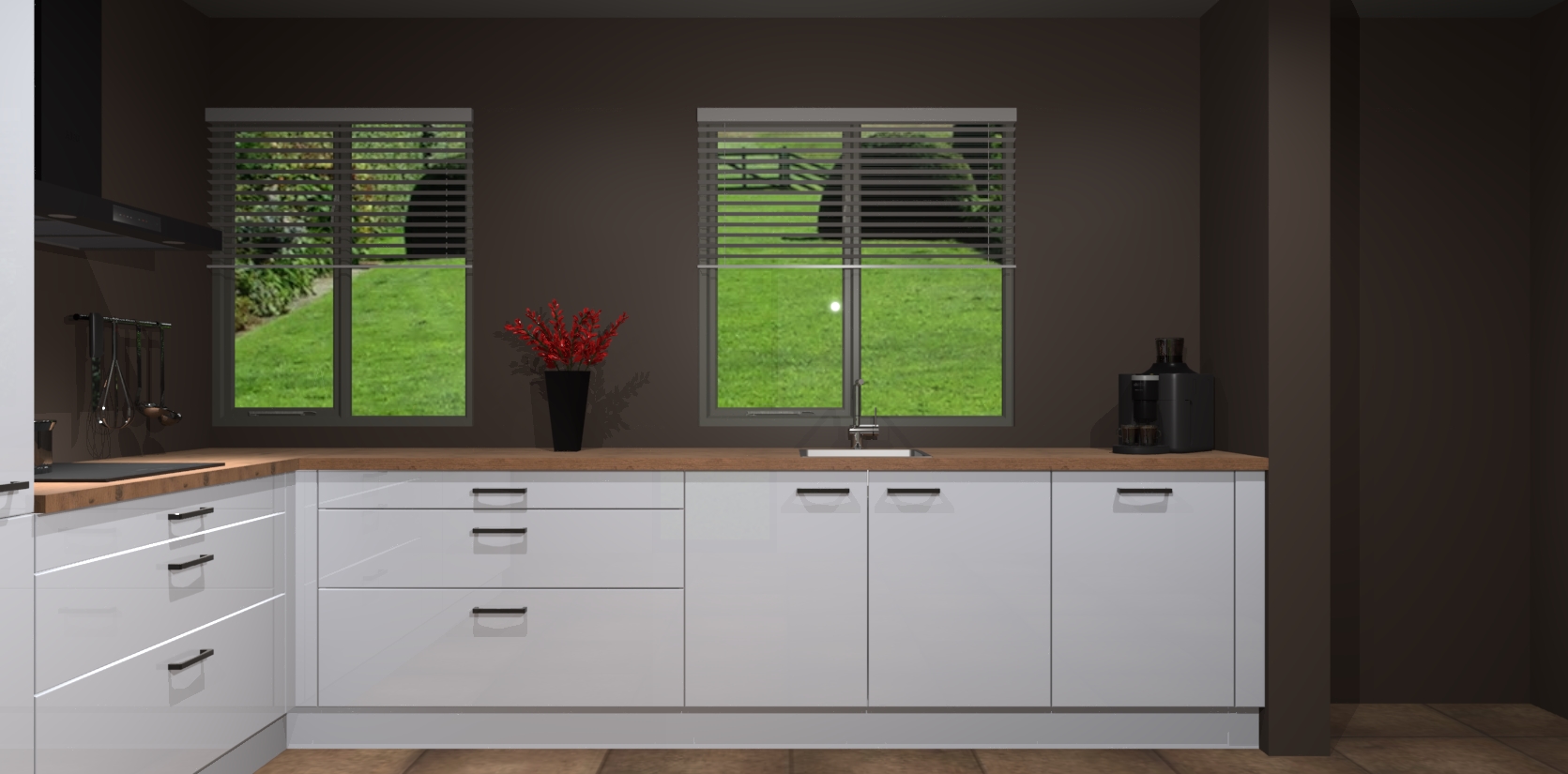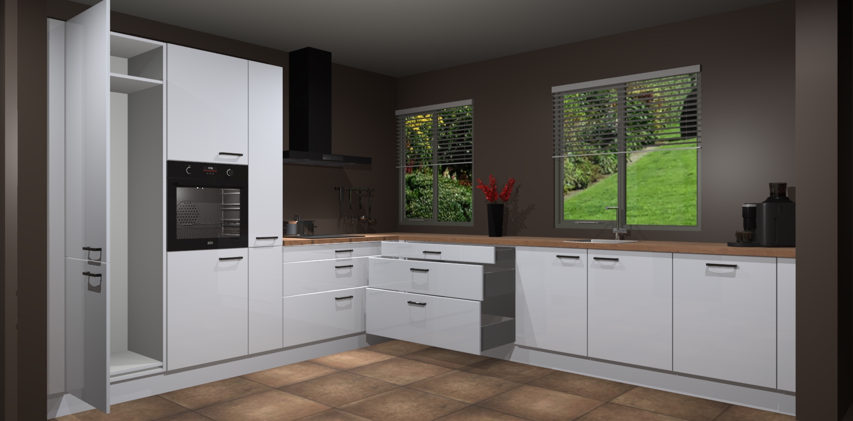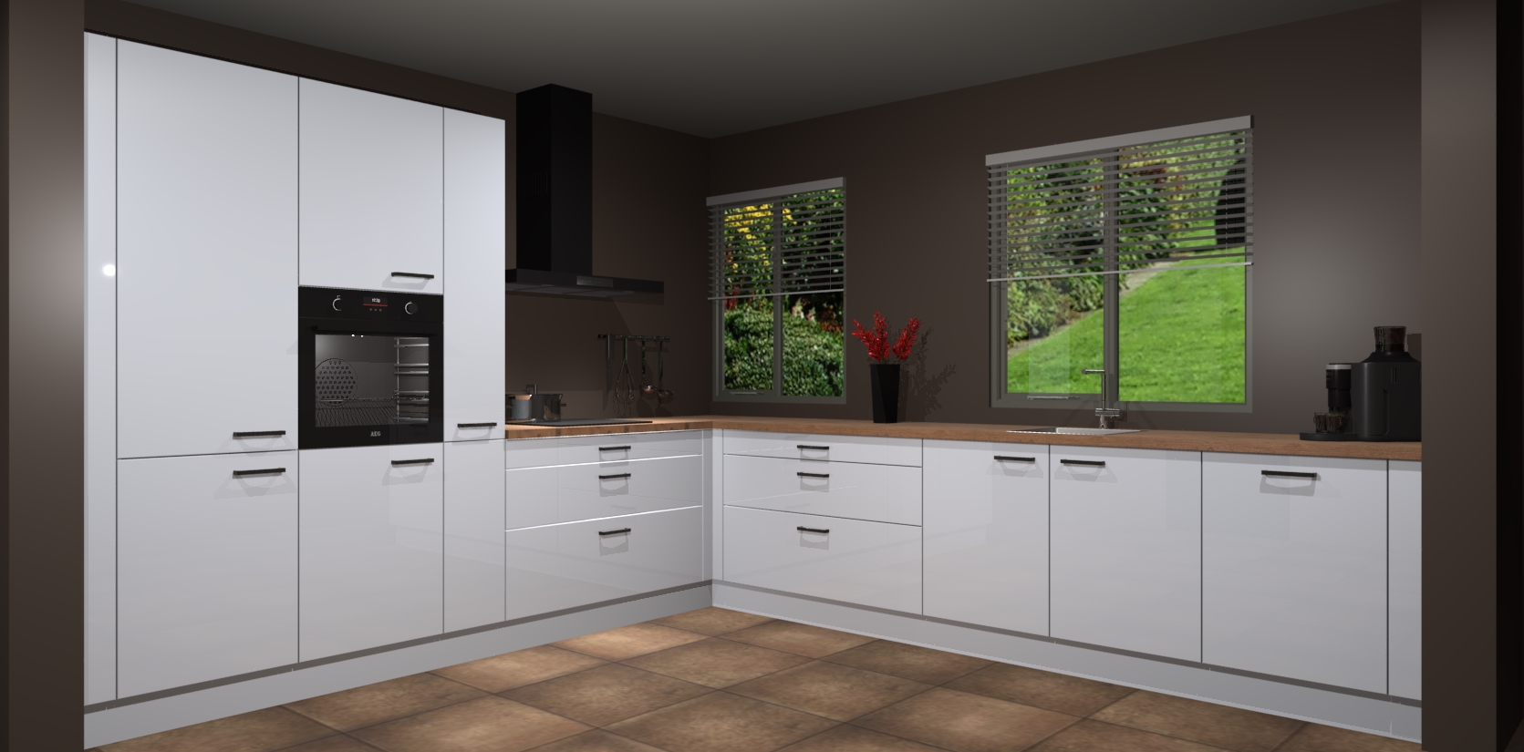 Welkom bij de Sneeuwwitte hoogglans keuken Palermo. Deze prachtige keuken zal de komende jaren het middelpunt van de belangstelling in uw huis zijn. Uitgerust met vijf inbouwapparaten komt u nooit kookgereedschap tekort. Bovendien geeft de warme houtlook elke ruimte een uitnodigende en tijdloze uitstraling.