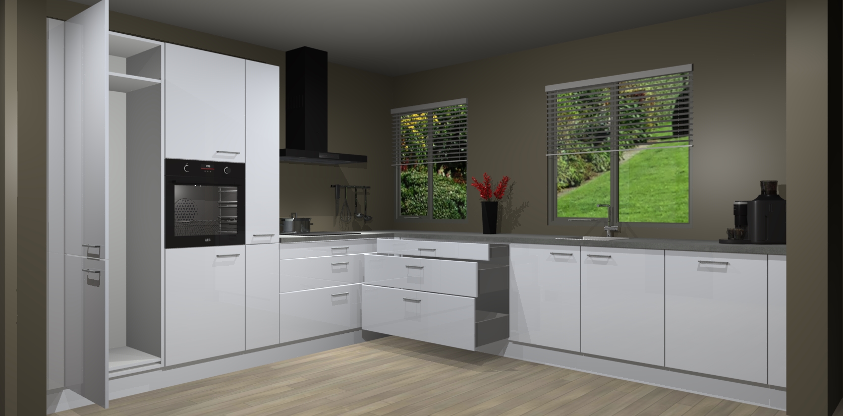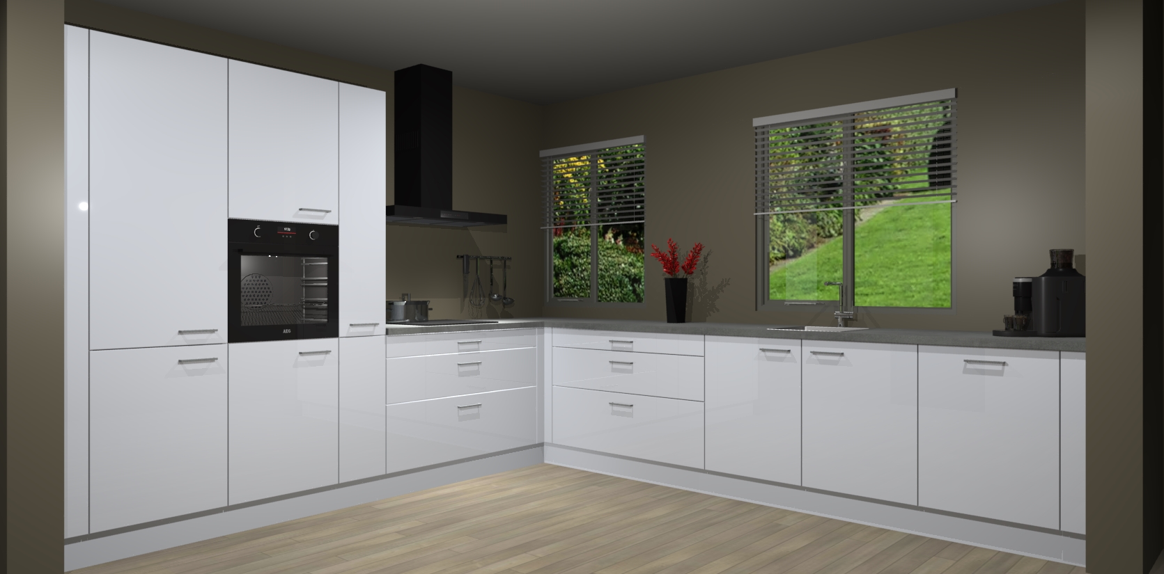 Welkom bij de Sneeuwwitte hoogglans keuken Palermo. Deze prachtige keuken zal de komende jaren het middelpunt van de belangstelling in uw huis zijn. Uitgerust met vijf inbouwapparaten komt u nooit kookgereedschap tekort. Bovendien geeft de warme houtlook elke ruimte een uitnodigende en tijdloze uitstraling.