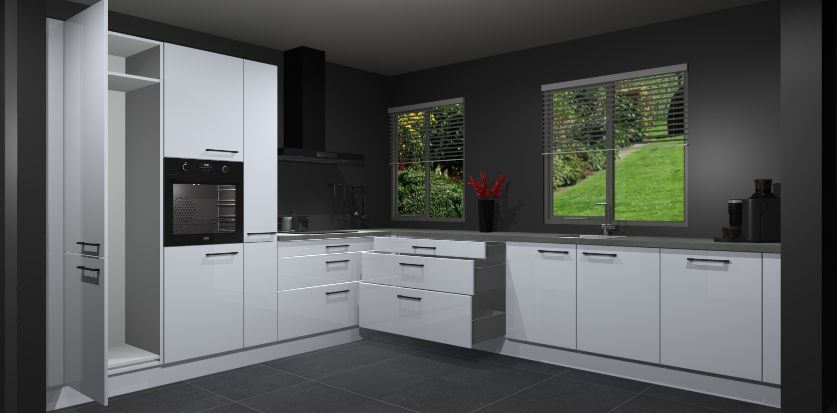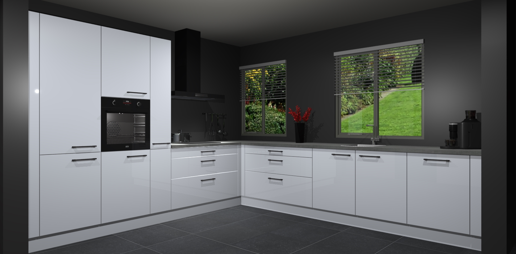 Welkom bij de Sneeuwwitte hoogglans keuken Palermo. Deze prachtige keuken zal de komende jaren het middelpunt van de belangstelling in uw huis zijn. Uitgerust met vijf inbouwapparaten komt u nooit kookgereedschap tekort. Bovendien geeft de warme houtlook elke ruimte een uitnodigende en tijdloze uitstraling.