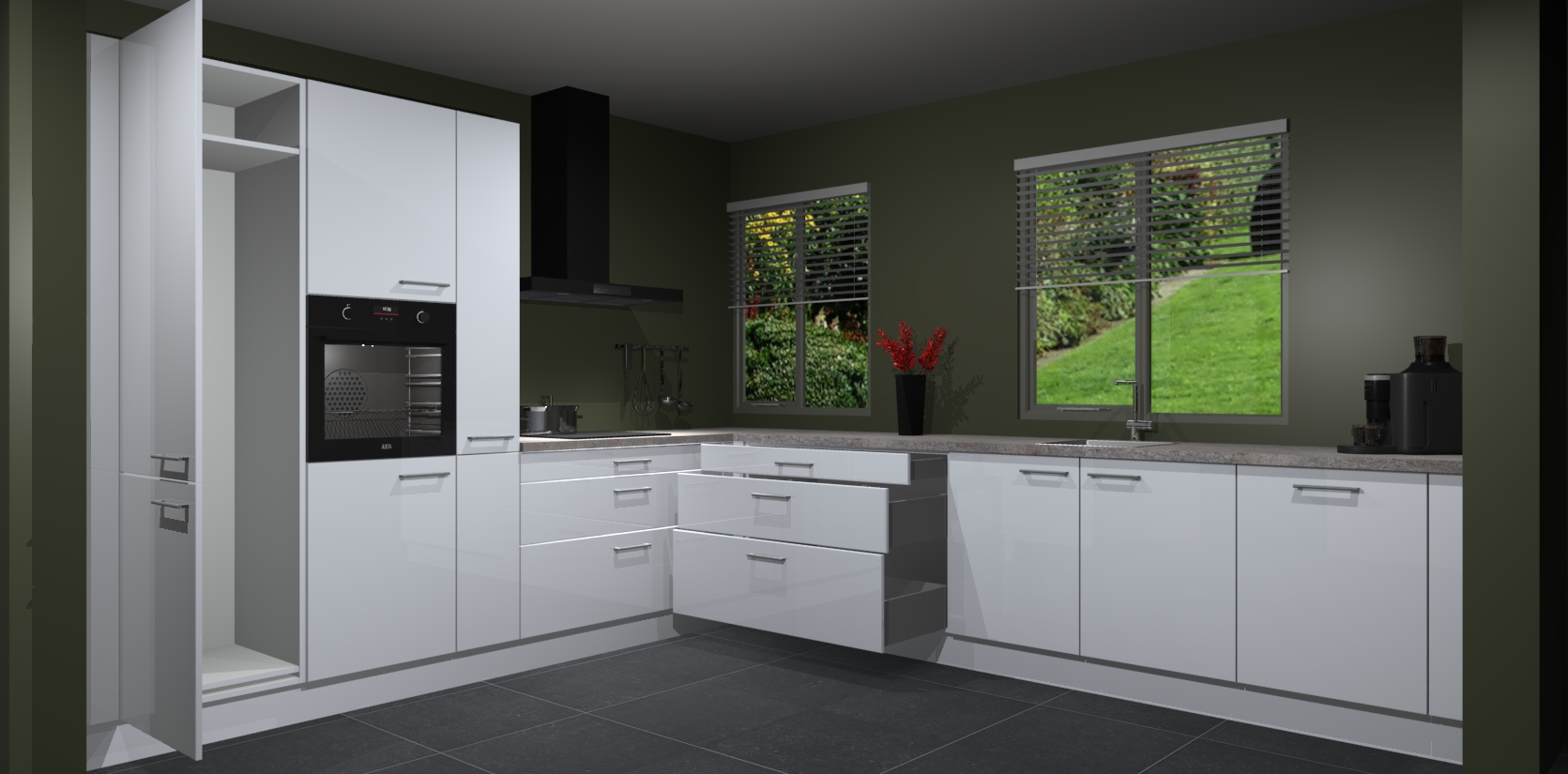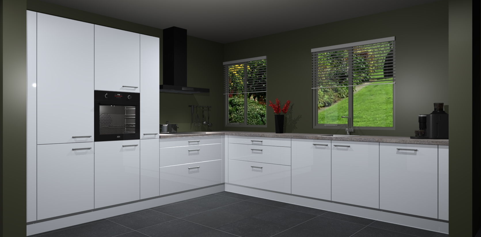 Welkom bij de Sneeuwwitte hoogglans keuken Palermo. Deze prachtige keuken zal de komende jaren het middelpunt van de belangstelling in uw huis zijn. Uitgerust met vijf inbouwapparaten komt u nooit kookgereedschap tekort. Bovendien geeft de warme houtlook elke ruimte een uitnodigende en tijdloze uitstraling.