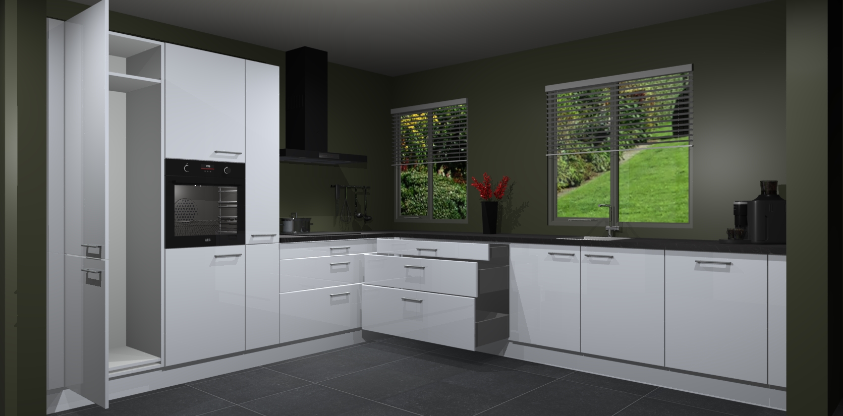 Welkom bij de Sneeuwwitte hoogglans keuken Palermo. Deze prachtige keuken zal de komende jaren het middelpunt van de belangstelling in uw huis zijn. Uitgerust met vijf inbouwapparaten komt u nooit kookgereedschap tekort. Bovendien geeft de warme houtlook elke ruimte een uitnodigende en tijdloze uitstraling.