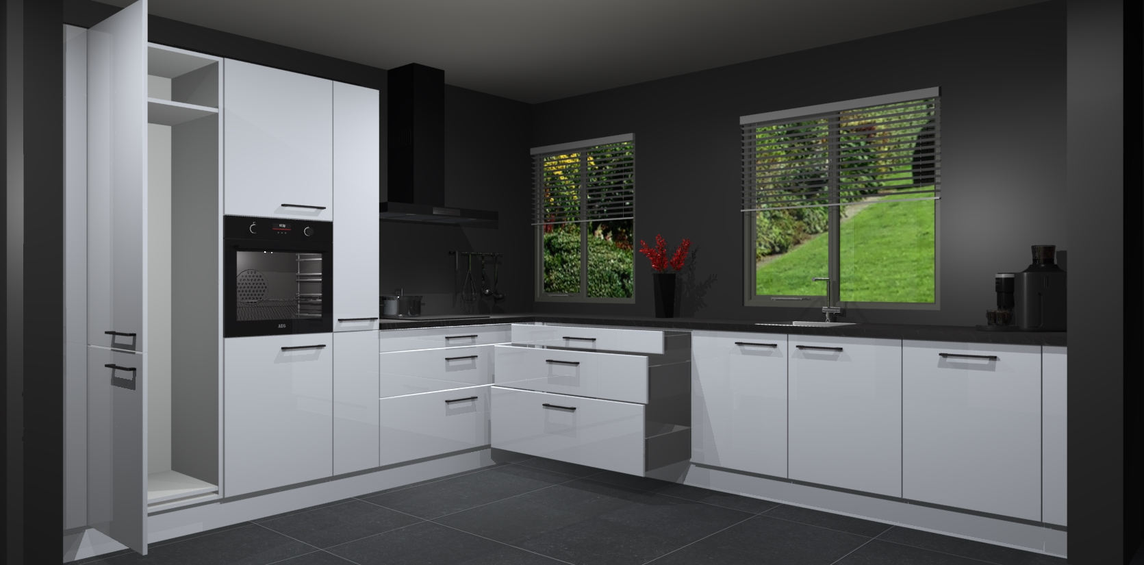 Welkom bij de Sneeuwwitte hoogglans keuken Palermo. Deze prachtige keuken zal de komende jaren het middelpunt van de belangstelling in uw huis zijn. Uitgerust met vijf inbouwapparaten komt u nooit kookgereedschap tekort. Bovendien geeft de warme houtlook elke ruimte een uitnodigende en tijdloze uitstraling.