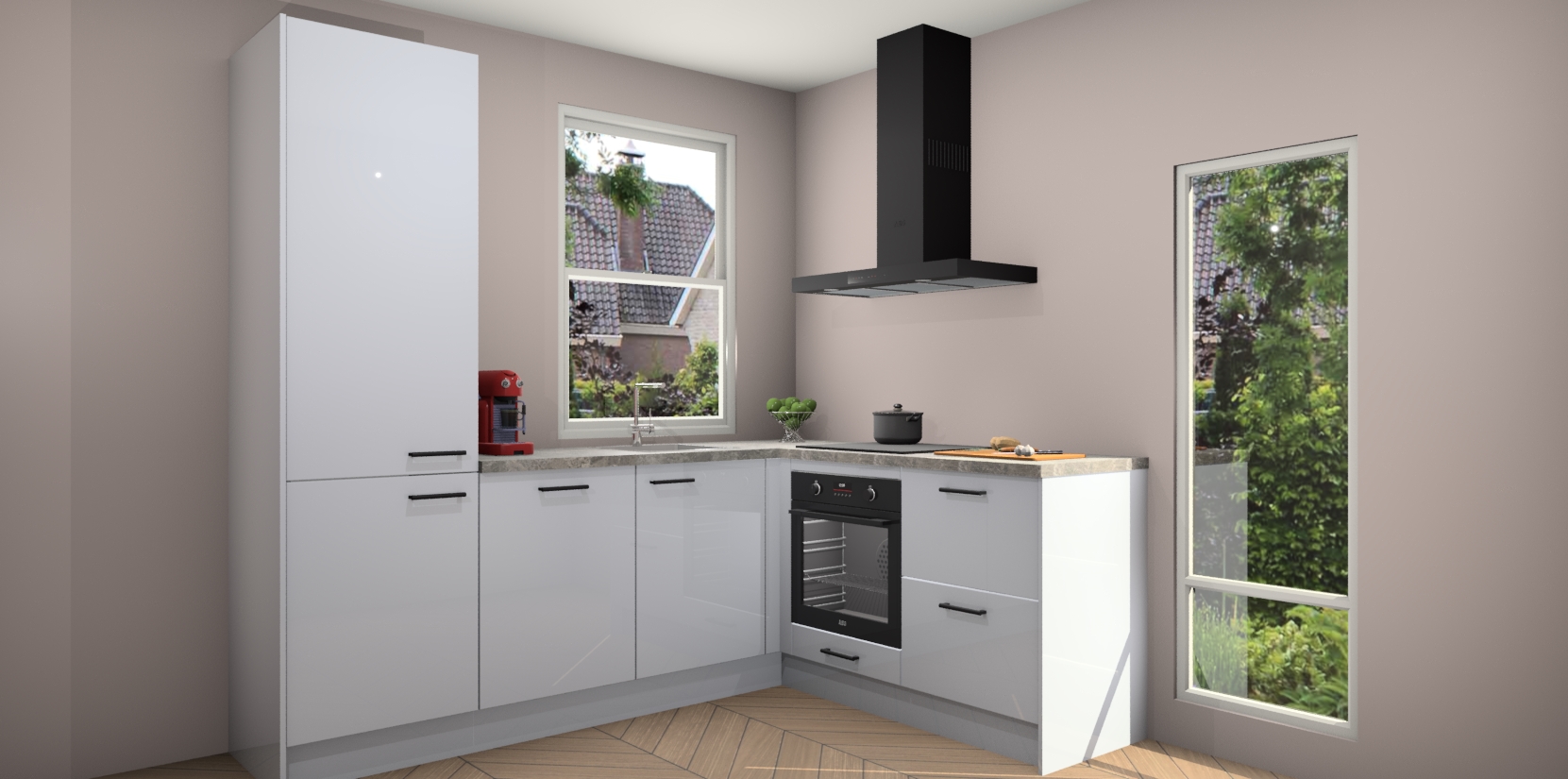 De Sneeuwwitte hoogglans keuken Phuket heeft alles wat u maar kunt wensen. Niet alleen zijn er softclose deuren, maar ook 5 ingebouwde apparaten: een oven, inductiekookplaat, afzuigkap, vaatwasser en koelkast - waarbij u later gemakkelijk naar het AEG merk, van inductiekookplaat naar kookplaat met geïntegreerde afzuiging of van oven naar combimagnetron kunt upgraden. Dat alles tegen een vast laag tarief! Bovendien geeft de Sneeuwwitte hoogglans keuken Phuket supersnelle levering van 7 weken. Echt iets voor u als u er niet op wilt wachten om het resultaat te zien in eigen keuken!