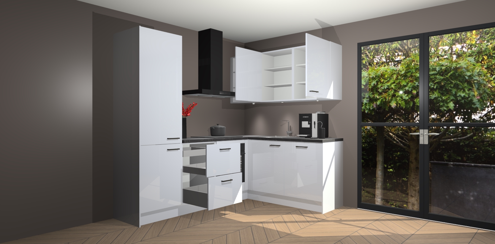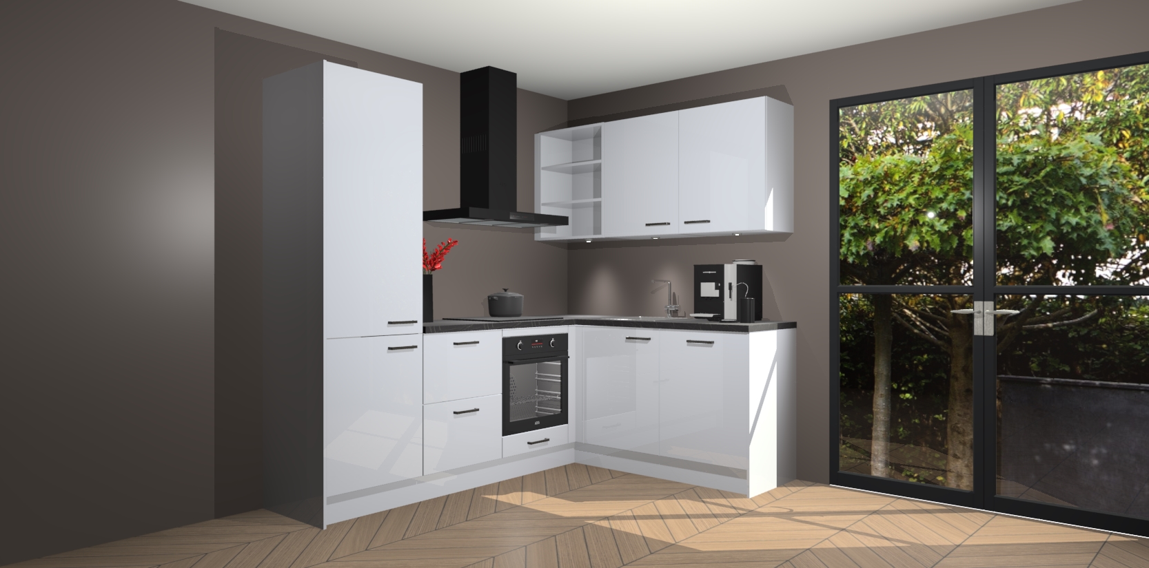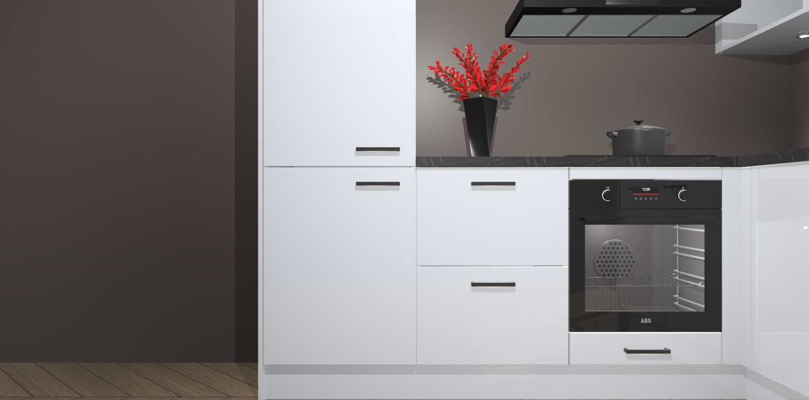 Wauw, dit is de Sneeuwwitte Hoogglans keuken Pilsen! U kunt gerust zeggen dat u elegantie combineert met functionaliteit met deze keuken. Met een modern en chique ontwerp is de keuken precies wat u nodig heeft om uw ruimte te verfraaien. De binnenzijde van de kasten is in dezelfde donkere kleur als de buitenzijde voor een uniforme look, compleet met softclose-kasten die stil sluiten.