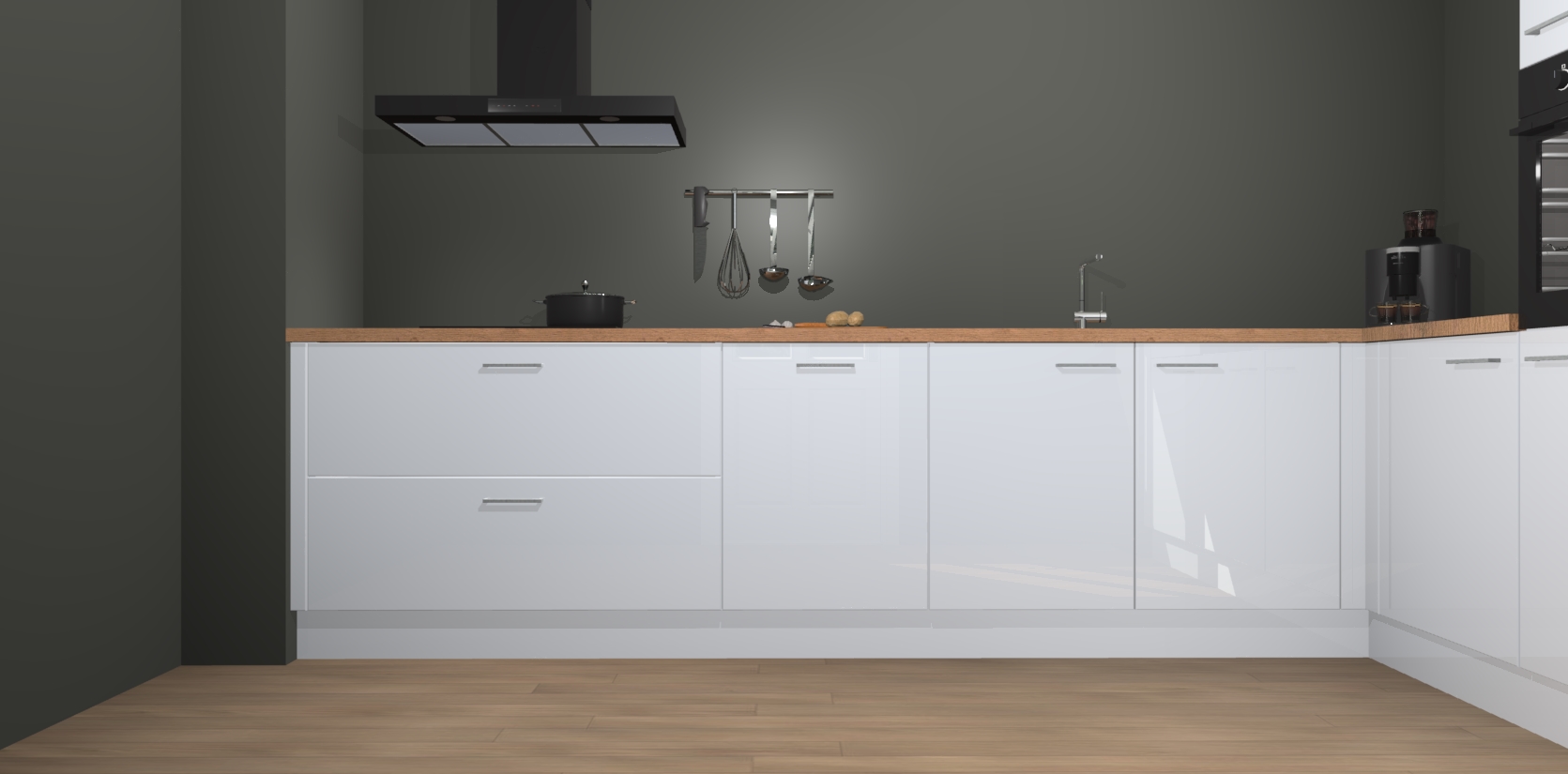 Welkom bij de Sneeuwwitte hoogglans keuken Portland. Deze prachtige keuken zal de komende jaren het middelpunt van de belangstelling in uw huis zijn. Uitgerust met vijf inbouwapparaten komt u nooit kookgereedschap tekort. Bovendien geeft de warme houtlook elke ruimte een uitnodigende en tijdloze uitstraling.