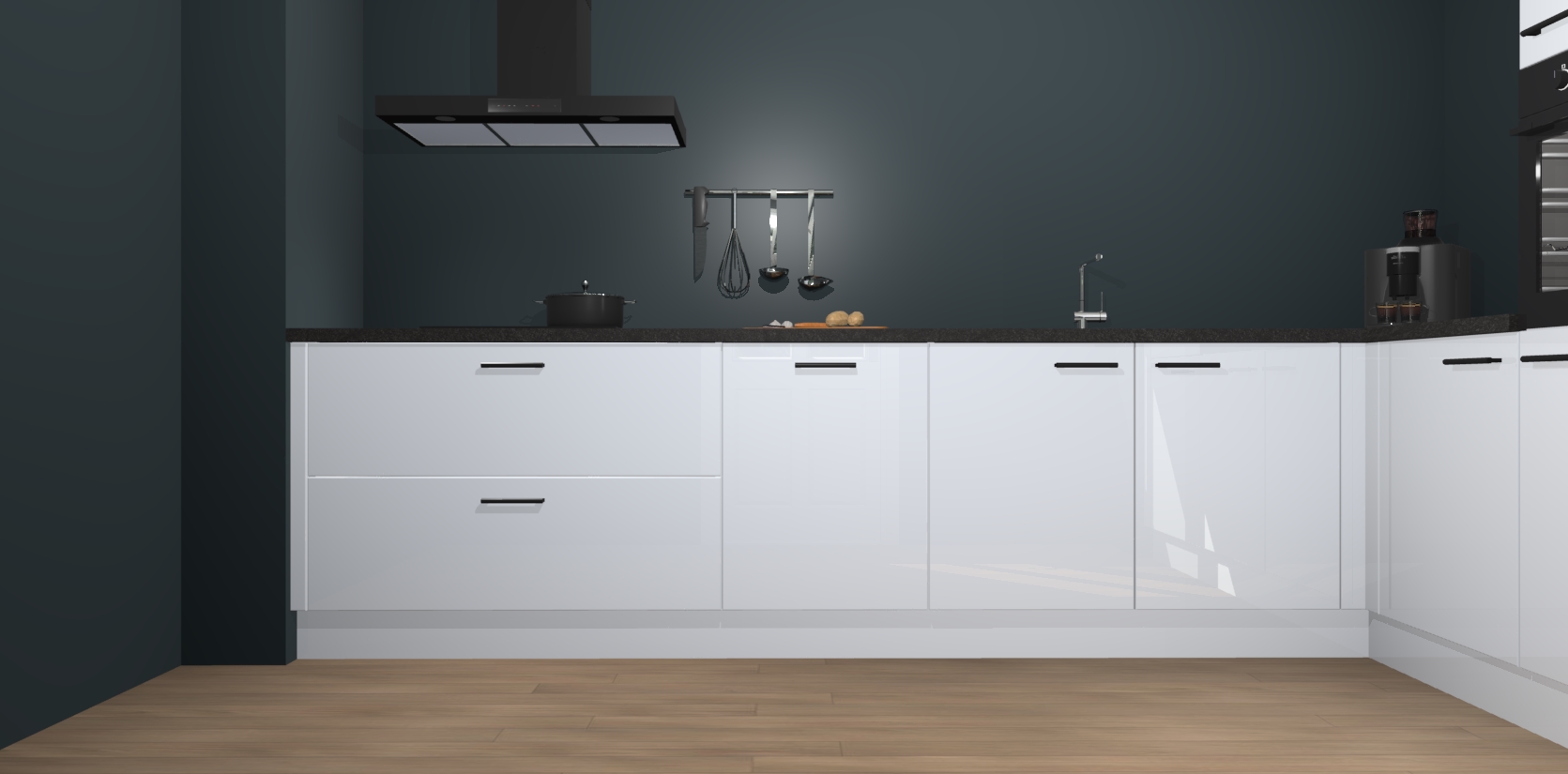 Welkom bij de Sneeuwwitte hoogglans keuken Portland. Deze prachtige keuken zal de komende jaren het middelpunt van de belangstelling in uw huis zijn. Uitgerust met vijf inbouwapparaten komt u nooit kookgereedschap tekort. Bovendien geeft de warme houtlook elke ruimte een uitnodigende en tijdloze uitstraling.
