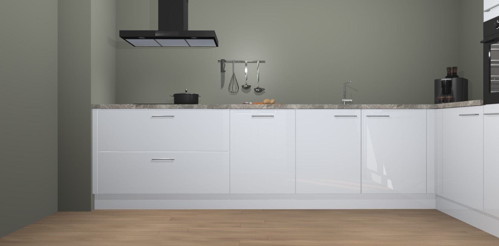 Welkom bij de Sneeuwwitte hoogglans keuken Portland. Deze prachtige keuken zal de komende jaren het middelpunt van de belangstelling in uw huis zijn. Uitgerust met vijf inbouwapparaten komt u nooit kookgereedschap tekort. Bovendien geeft de warme houtlook elke ruimte een uitnodigende en tijdloze uitstraling.