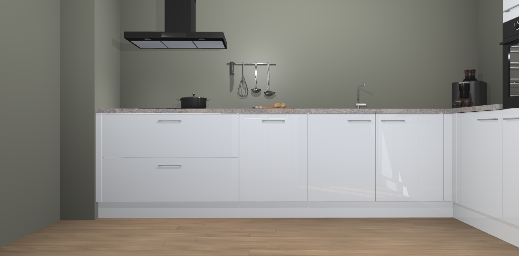 Welkom bij de Sneeuwwitte hoogglans keuken Portland. Deze prachtige keuken zal de komende jaren het middelpunt van de belangstelling in uw huis zijn. Uitgerust met vijf inbouwapparaten komt u nooit kookgereedschap tekort. Bovendien geeft de warme houtlook elke ruimte een uitnodigende en tijdloze uitstraling.