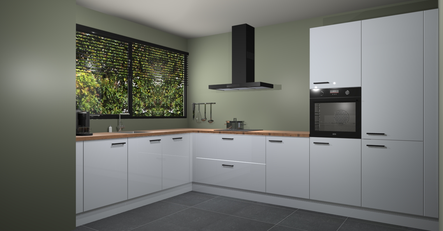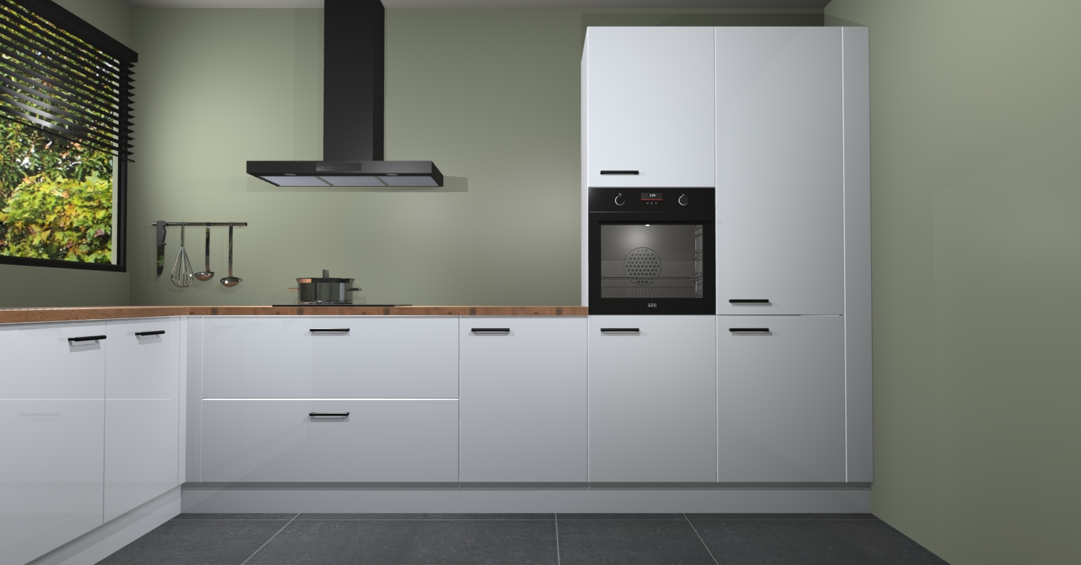 Met een modern, tijdloos design en ruime opslagruimte, zult u zich in no-time thuis voelen in uw nieuwe keuken. Uw leven wordt eenvoudiger met de soft-close deuren die voor het ultieme stille comfort zorgen - geen geluid dat u stoort terwijl u kookt. Ook is de keuken voorzien van 5 ingebouwde apparaten: een oven, inductie kookplaat, afzuigkap, vaatwasser en koelkast. Deze kunnen gemakkelijk na bestelling worden bijgewerkt naar AEG - waardoor uw luxe ervaring compleet is.