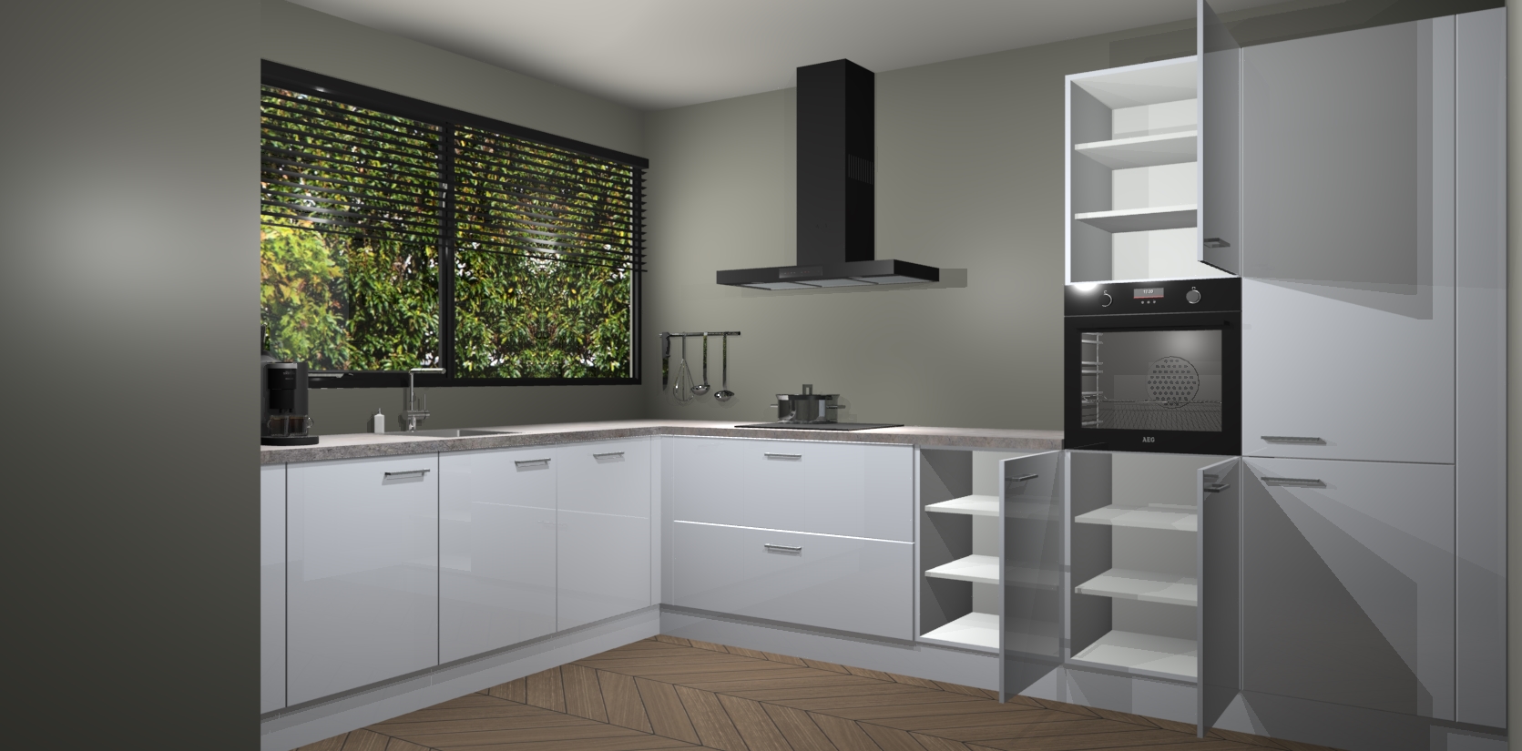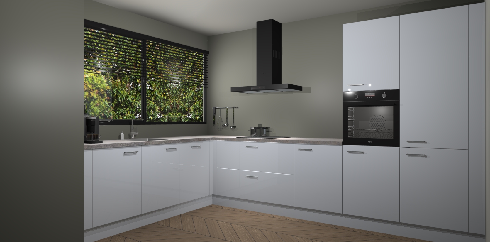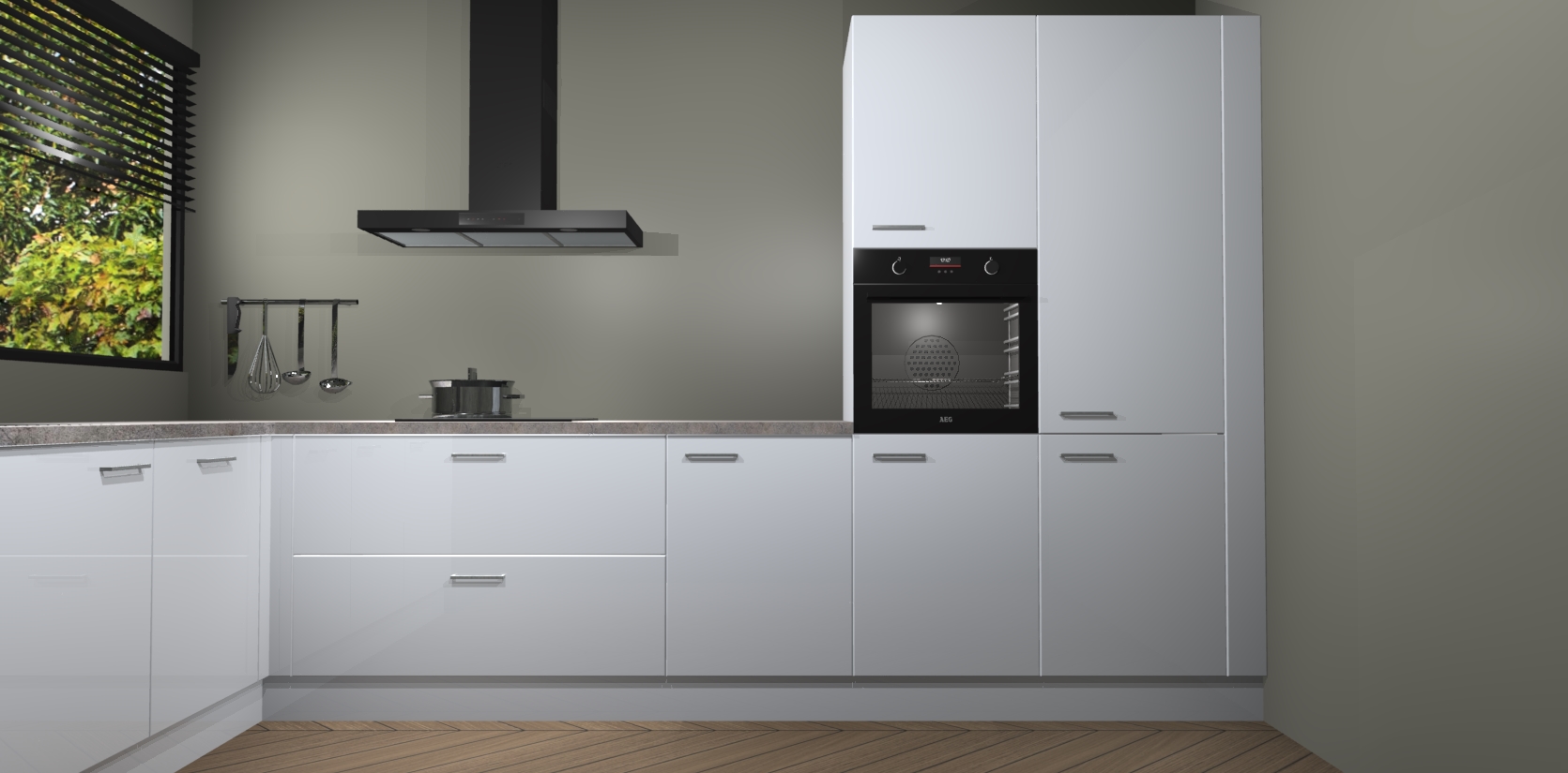 Met een modern, tijdloos design en ruime opslagruimte, zult u zich in no-time thuis voelen in uw nieuwe keuken. Uw leven wordt eenvoudiger met de soft-close deuren die voor het ultieme stille comfort zorgen - geen geluid dat u stoort terwijl u kookt. Ook is de keuken voorzien van 5 ingebouwde apparaten: een oven, inductie kookplaat, afzuigkap, vaatwasser en koelkast. Deze kunnen gemakkelijk na bestelling worden bijgewerkt naar AEG - waardoor uw luxe ervaring compleet is.