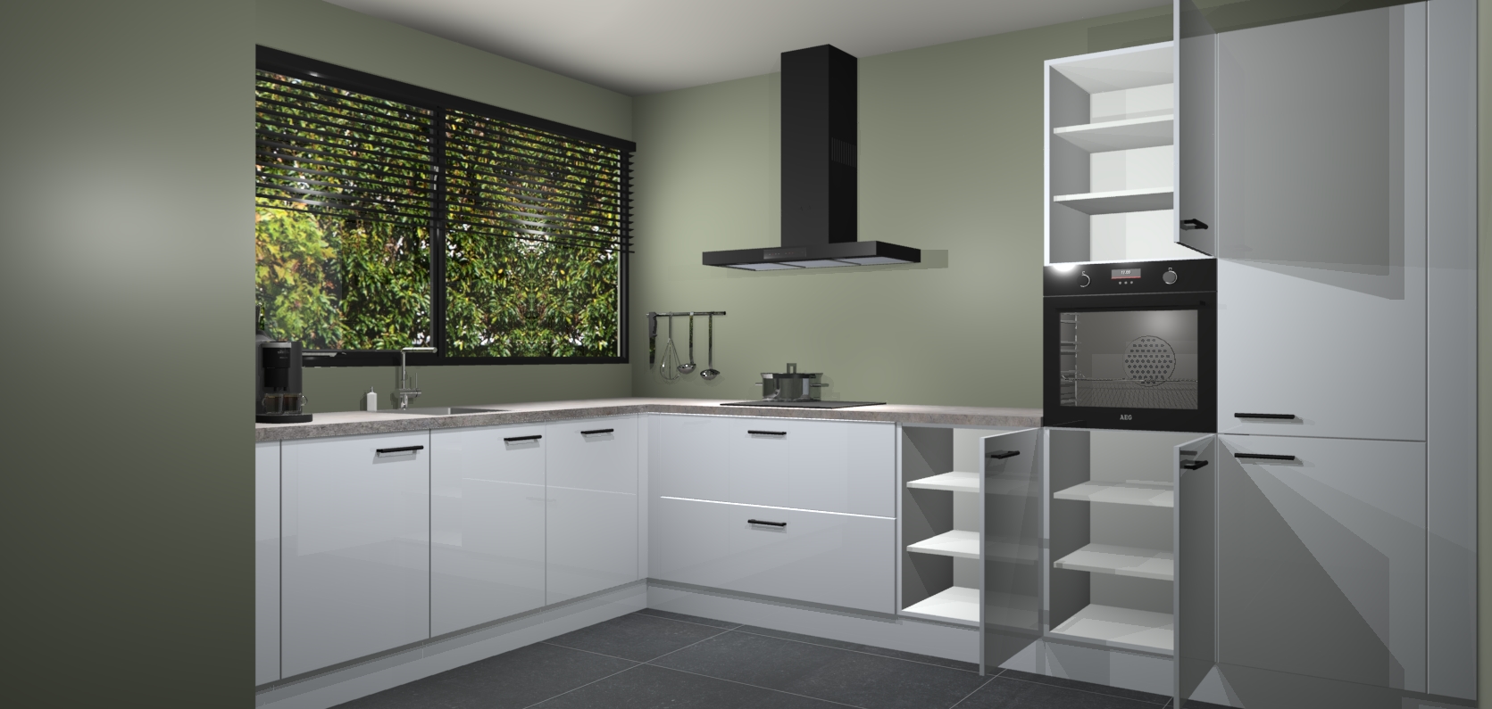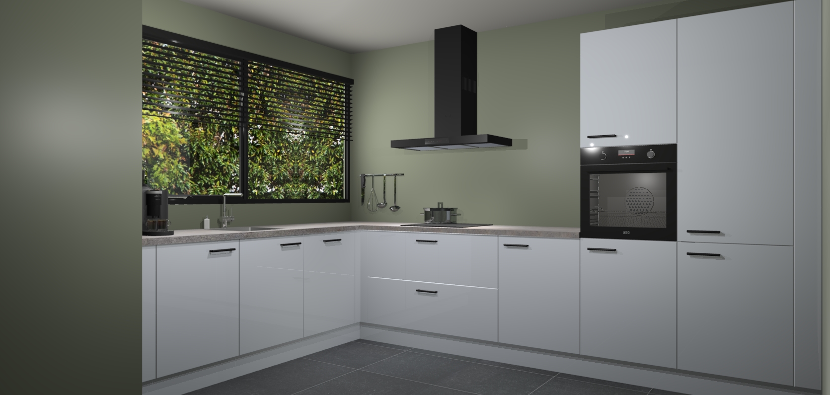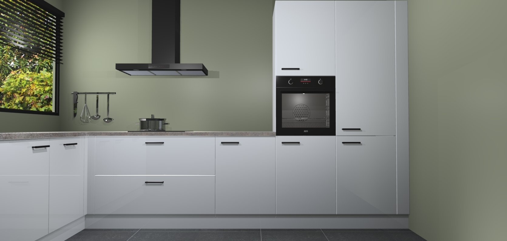 Met een modern, tijdloos design en ruime opslagruimte, zult u zich in no-time thuis voelen in uw nieuwe keuken. Uw leven wordt eenvoudiger met de soft-close deuren die voor het ultieme stille comfort zorgen - geen geluid dat u stoort terwijl u kookt. Ook is de keuken voorzien van 5 ingebouwde apparaten: een oven, inductie kookplaat, afzuigkap, vaatwasser en koelkast. Deze kunnen gemakkelijk na bestelling worden bijgewerkt naar AEG - waardoor uw luxe ervaring compleet is.