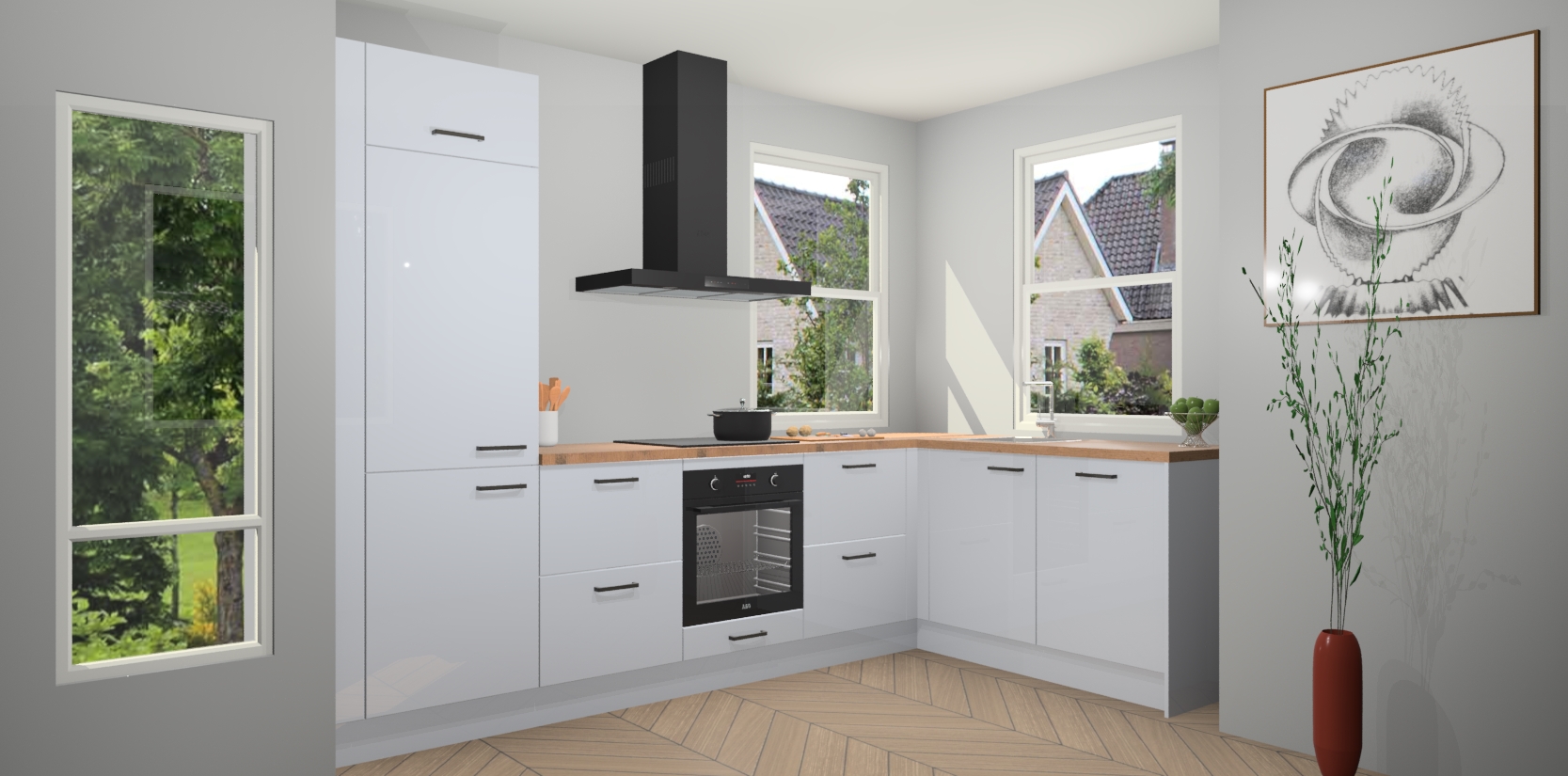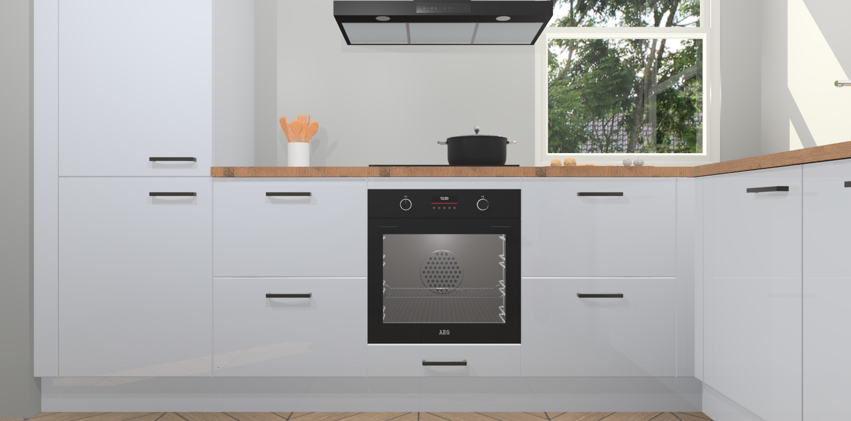 Wat maakt deze keuken zo bijzonder? Ten eerste geeft het houten werkblad uw ruimte een onmiskenbaar klassieke uitstraling. De natuurlijke afwerking roept warmte en elegantie op die nooit uit de mode zullen raken. Bovendien is het gemakkelijk schoon te houden en te onderhouden, zodat je er jarenlang plezier van kunt hebben. Als u op zoek bent naar extra gemak in uw keuken, dan heeft u bij het plaatsen van een bestelling bij ons ook de optie om uw toestellen te upgraden naar AEG-modellen - zo haalt u moderne innovatie van topmerken in apparatentechnologie rechtstreeks in huis.