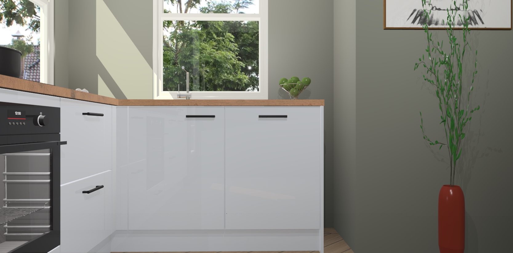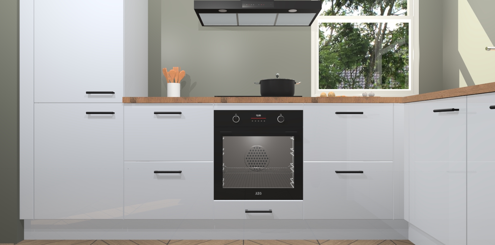 Wat maakt deze keuken zo bijzonder? Ten eerste geeft het houten werkblad uw ruimte een onmiskenbaar klassieke uitstraling. De natuurlijke afwerking roept warmte en elegantie op die nooit uit de mode zullen raken. Bovendien is het gemakkelijk schoon te houden en te onderhouden, zodat je er jarenlang plezier van kunt hebben. Als u op zoek bent naar extra gemak in uw keuken, dan heeft u bij het plaatsen van een bestelling bij ons ook de optie om uw toestellen te upgraden naar AEG-modellen - zo haalt u moderne innovatie van topmerken in apparatentechnologie rechtstreeks in huis.