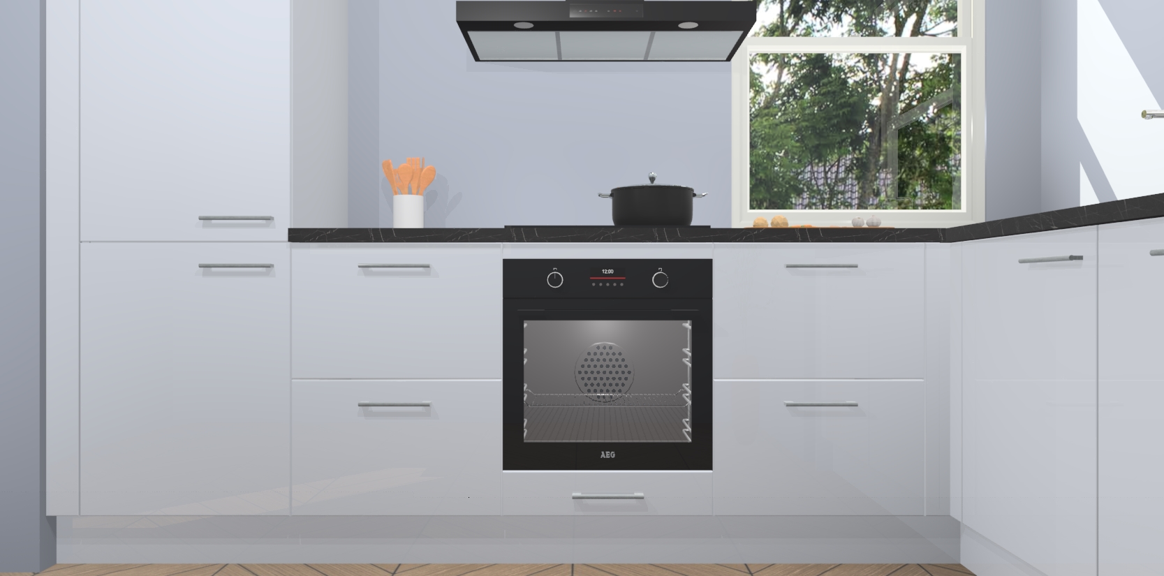 Wat maakt deze keuken zo bijzonder? Ten eerste geeft het houten werkblad uw ruimte een onmiskenbaar klassieke uitstraling. De natuurlijke afwerking roept warmte en elegantie op die nooit uit de mode zullen raken. Bovendien is het gemakkelijk schoon te houden en te onderhouden, zodat je er jarenlang plezier van kunt hebben. Als u op zoek bent naar extra gemak in uw keuken, dan heeft u bij het plaatsen van een bestelling bij ons ook de optie om uw toestellen te upgraden naar AEG-modellen - zo haalt u moderne innovatie van topmerken in apparatentechnologie rechtstreeks in huis.