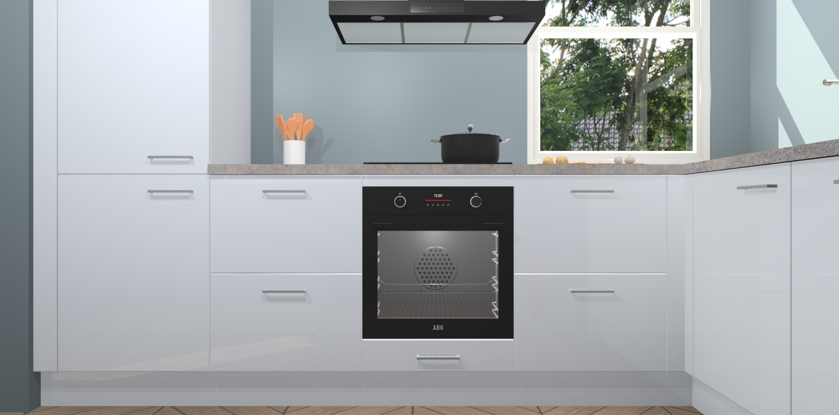 Wat maakt deze keuken zo bijzonder? Ten eerste geeft het houten werkblad uw ruimte een onmiskenbaar klassieke uitstraling. De natuurlijke afwerking roept warmte en elegantie op die nooit uit de mode zullen raken. Bovendien is het gemakkelijk schoon te houden en te onderhouden, zodat je er jarenlang plezier van kunt hebben. Als u op zoek bent naar extra gemak in uw keuken, dan heeft u bij het plaatsen van een bestelling bij ons ook de optie om uw toestellen te upgraden naar AEG-modellen - zo haalt u moderne innovatie van topmerken in apparatentechnologie rechtstreeks in huis.