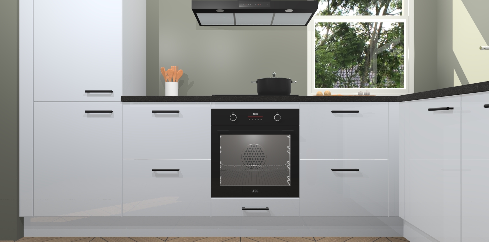 Wat maakt deze keuken zo bijzonder? Ten eerste geeft het houten werkblad uw ruimte een onmiskenbaar klassieke uitstraling. De natuurlijke afwerking roept warmte en elegantie op die nooit uit de mode zullen raken. Bovendien is het gemakkelijk schoon te houden en te onderhouden, zodat je er jarenlang plezier van kunt hebben. Als u op zoek bent naar extra gemak in uw keuken, dan heeft u bij het plaatsen van een bestelling bij ons ook de optie om uw toestellen te upgraden naar AEG-modellen - zo haalt u moderne innovatie van topmerken in apparatentechnologie rechtstreeks in huis.