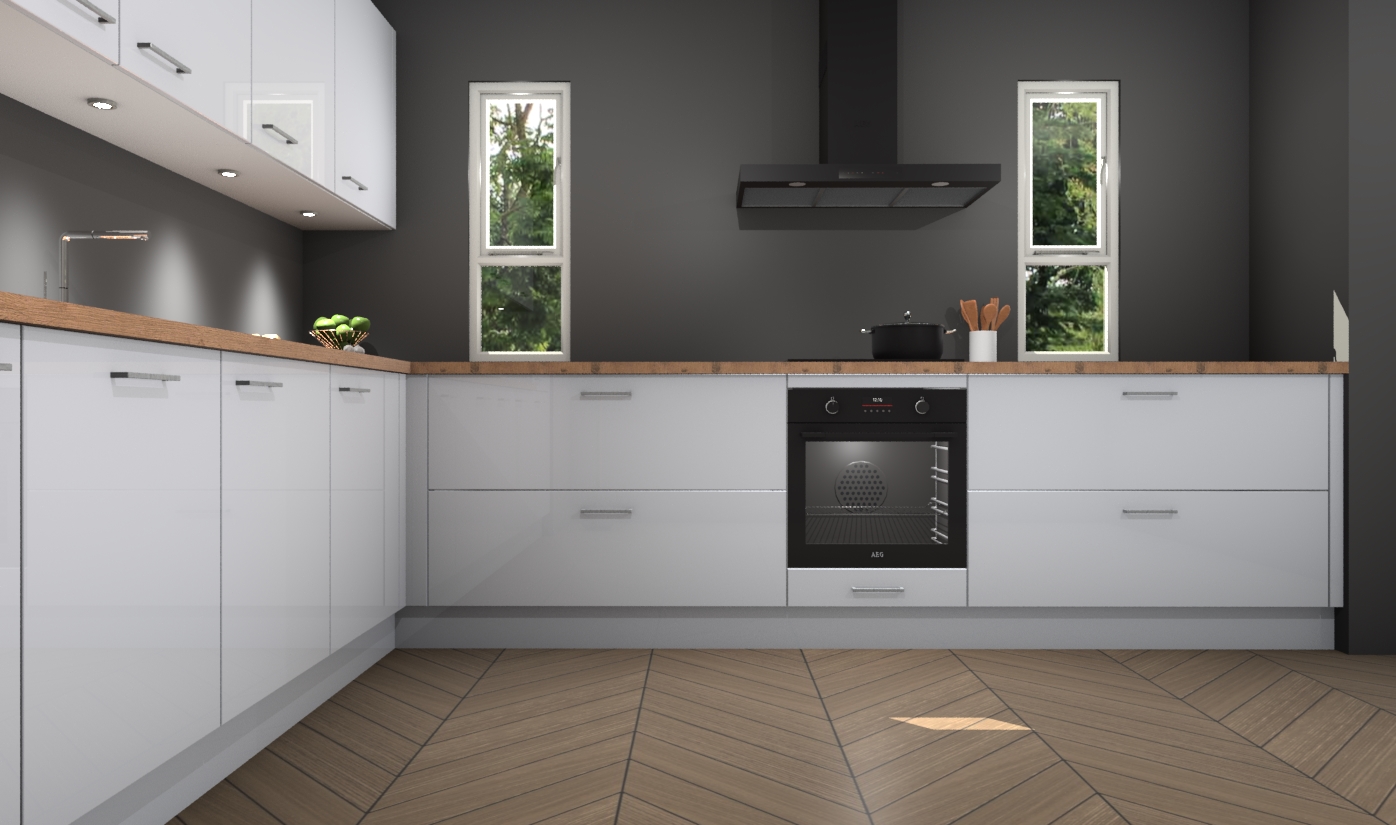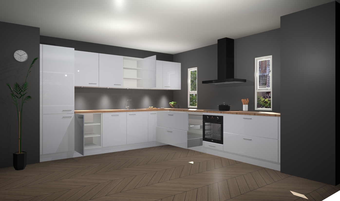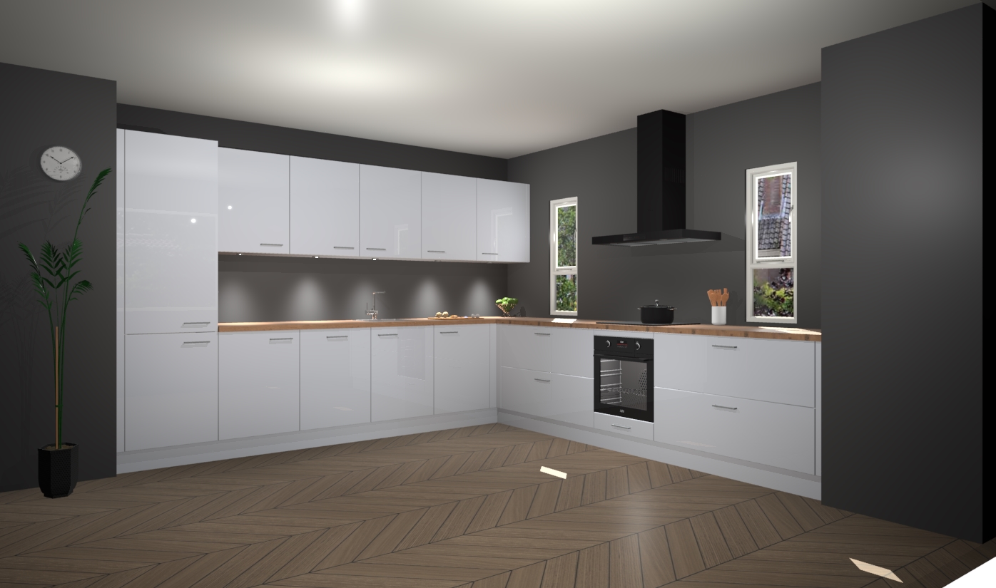 De sneeuwwitte hoogglans keuken is een ideale hoekkeuken en heeft alle functies en apparatuur die u maar nodig kunt hebben. Bij de bestelling krijgt u een oven, inductiekookplaat, afzuigkap, vaatwasser en koelkast - deze kunnen desgewenst eenvoudig worden uitgebreid naar AEG na bestellen. Elke kast wordt ook voor gemonteerd geleverd met soft close deuren die jarenlang gebruik beloven. Stelt u zich voor dat u geen gedoe heeft met vervelende montage - vanaf het moment dat u uw bestelling plaats, duurt het slechts 7 weken voor het bij u thuis geleverd wordt.