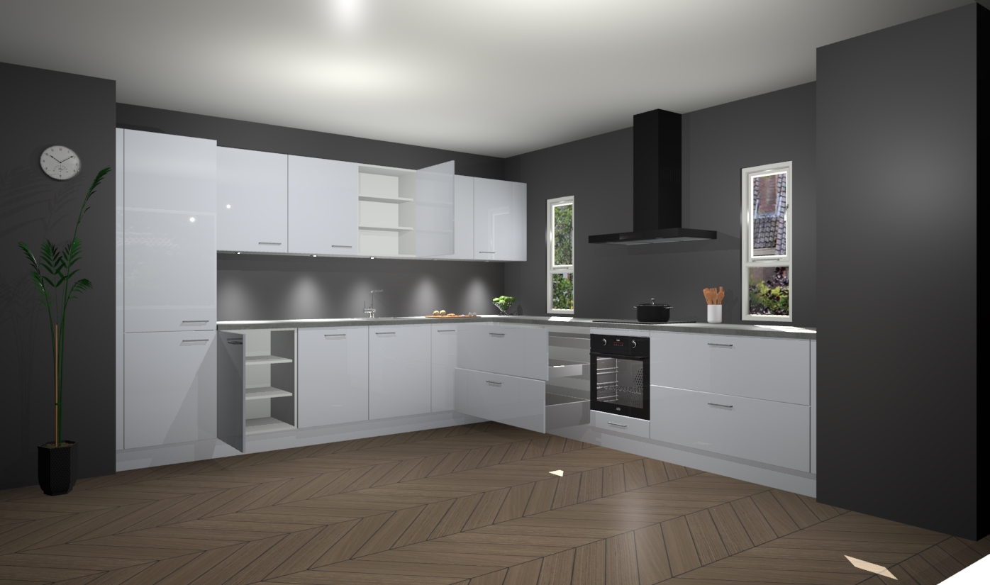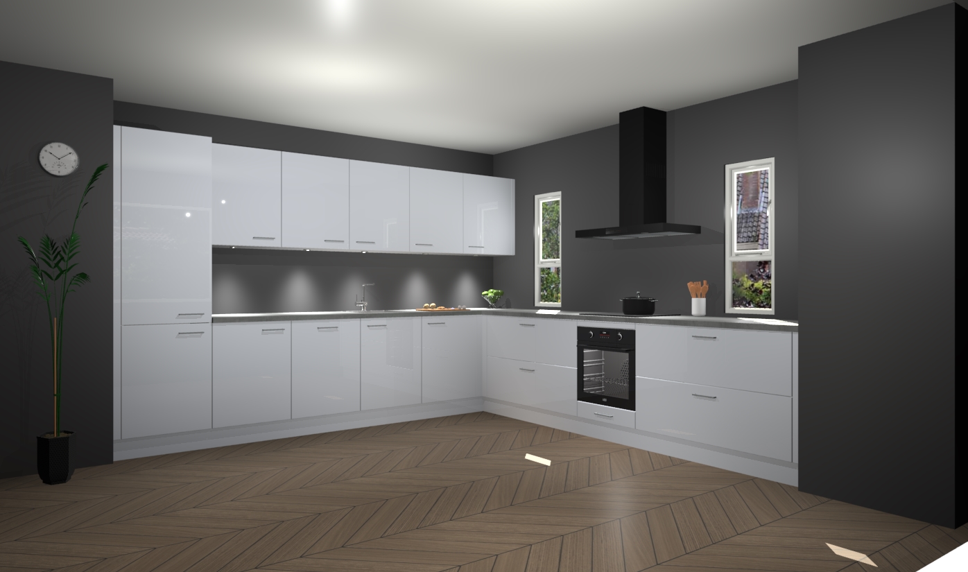 De sneeuwwitte hoogglans keuken is een ideale hoekkeuken en heeft alle functies en apparatuur die u maar nodig kunt hebben. Bij de bestelling krijgt u een oven, inductiekookplaat, afzuigkap, vaatwasser en koelkast - deze kunnen desgewenst eenvoudig worden uitgebreid naar AEG na bestellen. Elke kast wordt ook voor gemonteerd geleverd met soft close deuren die jarenlang gebruik beloven. Stelt u zich voor dat u geen gedoe heeft met vervelende montage - vanaf het moment dat u uw bestelling plaats, duurt het slechts 7 weken voor het bij u thuis geleverd wordt.