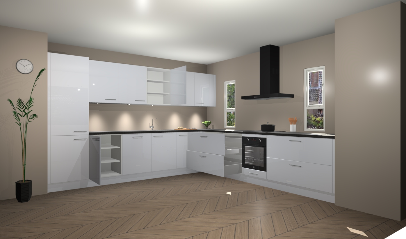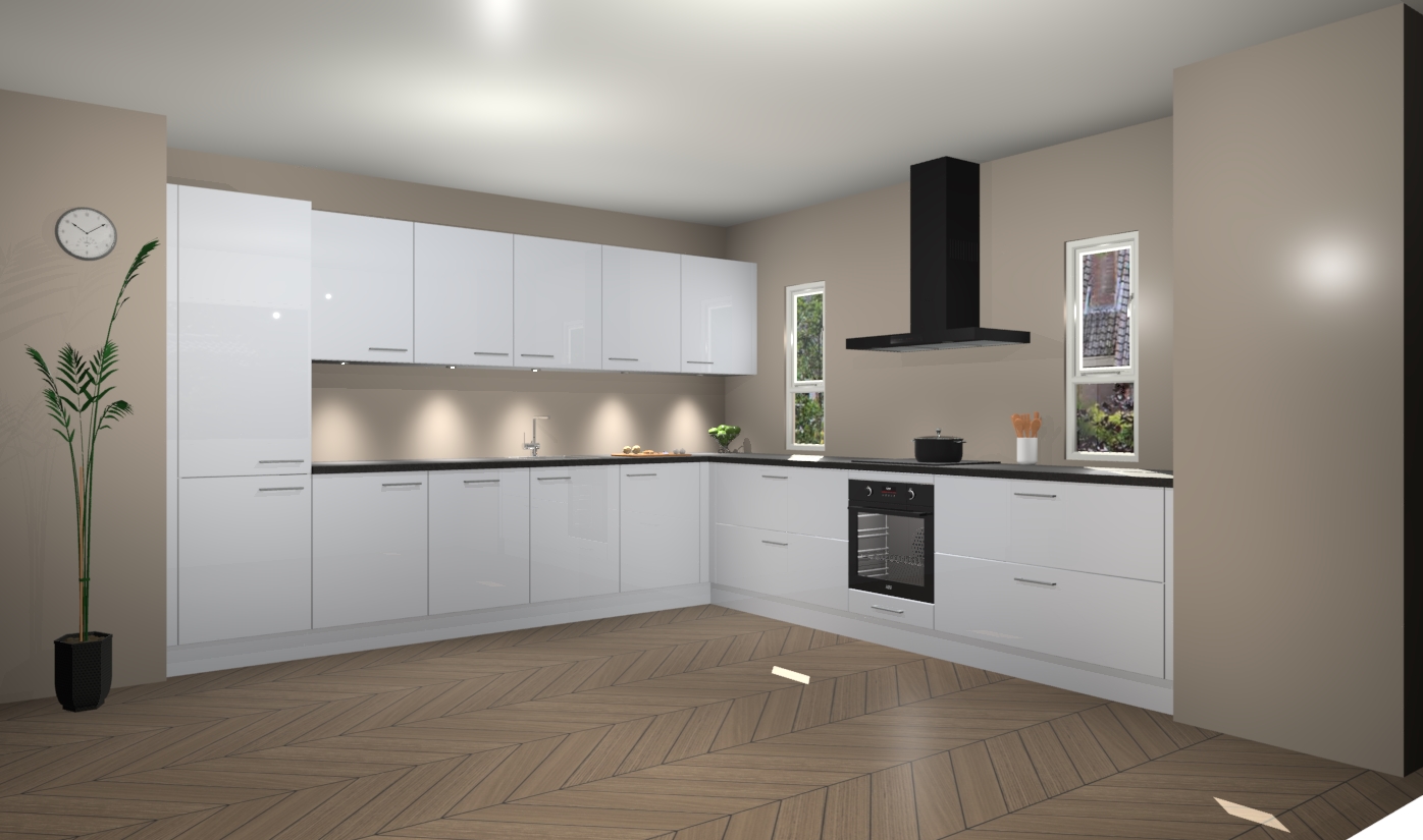 De sneeuwwitte hoogglans keuken is een ideale hoekkeuken en heeft alle functies en apparatuur die u maar nodig kunt hebben. Bij de bestelling krijgt u een oven, inductiekookplaat, afzuigkap, vaatwasser en koelkast - deze kunnen desgewenst eenvoudig worden uitgebreid naar AEG na bestellen. Elke kast wordt ook voor gemonteerd geleverd met soft close deuren die jarenlang gebruik beloven. Stelt u zich voor dat u geen gedoe heeft met vervelende montage - vanaf het moment dat u uw bestelling plaats, duurt het slechts 7 weken voor het bij u thuis geleverd wordt.