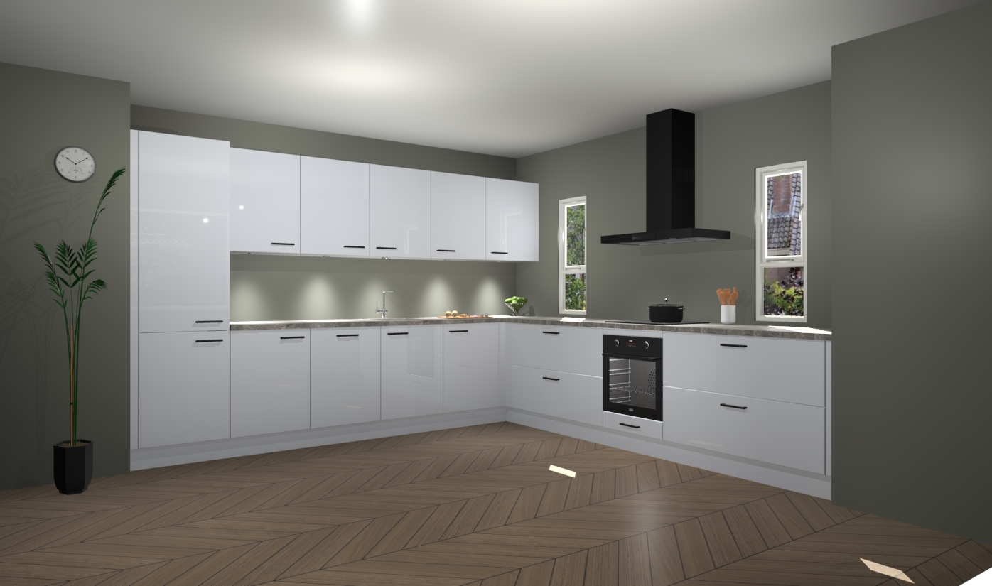 De sneeuwwitte hoogglans keuken is een ideale hoekkeuken en heeft alle functies en apparatuur die u maar nodig kunt hebben. Bij de bestelling krijgt u een oven, inductiekookplaat, afzuigkap, vaatwasser en koelkast - deze kunnen desgewenst eenvoudig worden uitgebreid naar AEG na bestellen. Elke kast wordt ook voor gemonteerd geleverd met soft close deuren die jarenlang gebruik beloven. Stelt u zich voor dat u geen gedoe heeft met vervelende montage - vanaf het moment dat u uw bestelling plaats, duurt het slechts 7 weken voor het bij u thuis geleverd wordt.