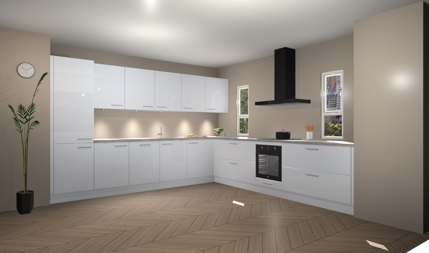 De sneeuwwitte hoogglans keuken is een ideale hoekkeuken en heeft alle functies en apparatuur die u maar nodig kunt hebben. Bij de bestelling krijgt u een oven, inductiekookplaat, afzuigkap, vaatwasser en koelkast - deze kunnen desgewenst eenvoudig worden uitgebreid naar AEG na bestellen. Elke kast wordt ook voor gemonteerd geleverd met soft close deuren die jarenlang gebruik beloven. Stelt u zich voor dat u geen gedoe heeft met vervelende montage - vanaf het moment dat u uw bestelling plaats, duurt het slechts 7 weken voor het bij u thuis geleverd wordt.