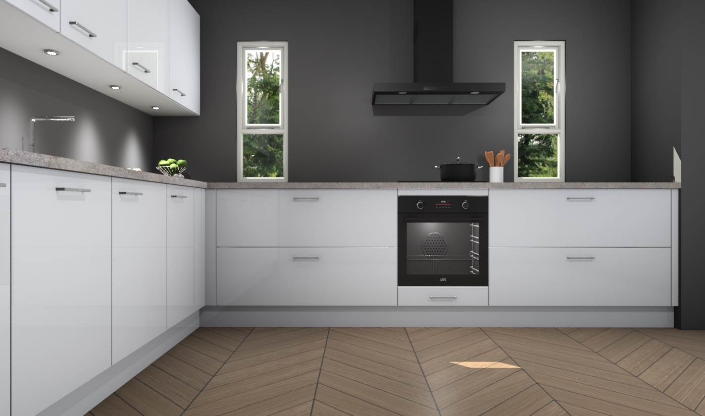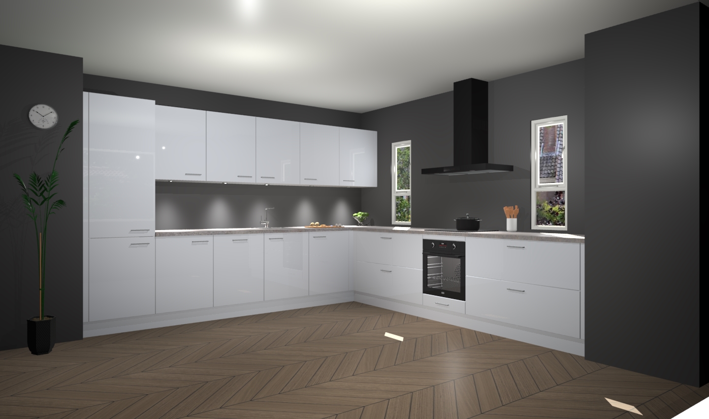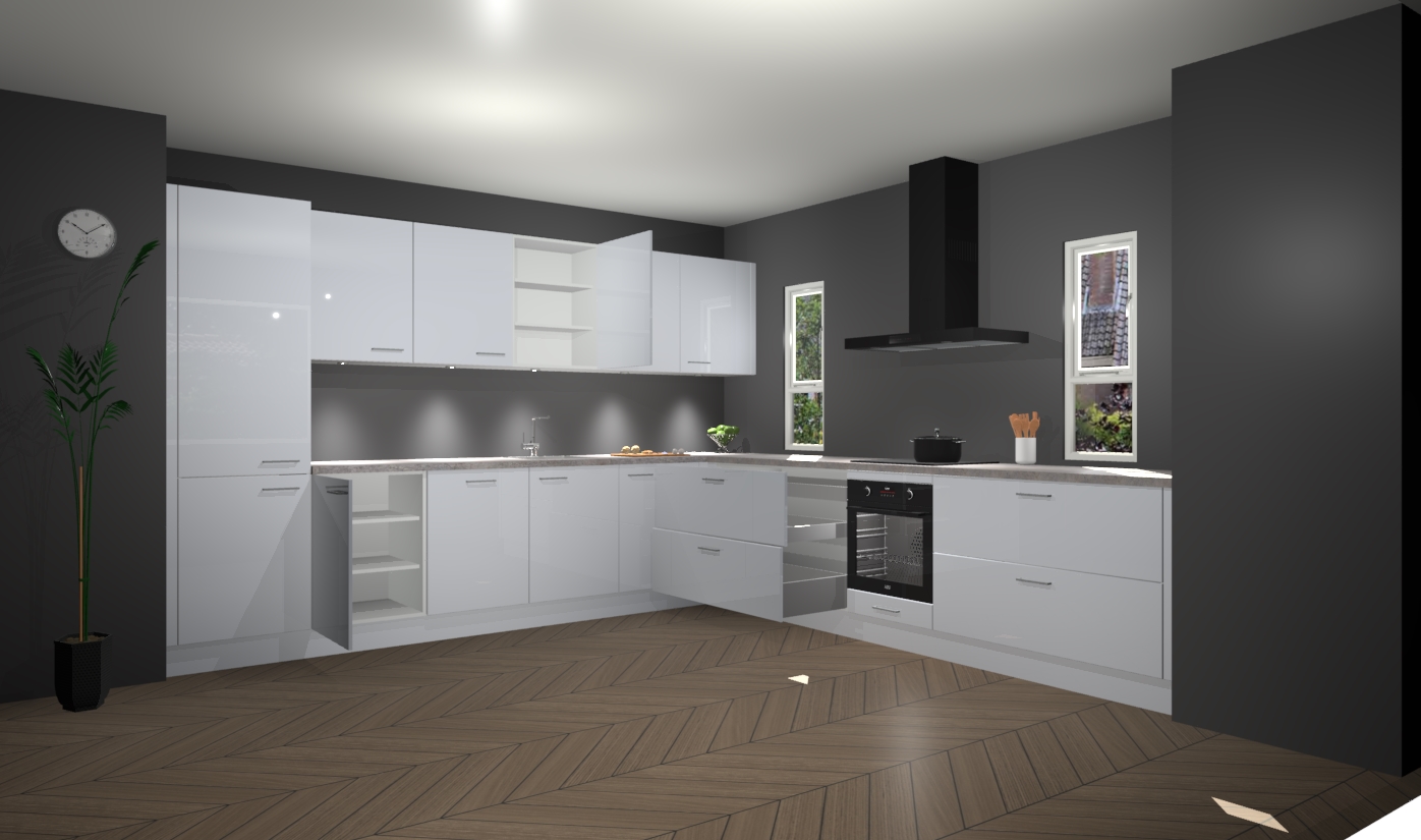 De sneeuwwitte hoogglans keuken is een ideale hoekkeuken en heeft alle functies en apparatuur die u maar nodig kunt hebben. Bij de bestelling krijgt u een oven, inductiekookplaat, afzuigkap, vaatwasser en koelkast - deze kunnen desgewenst eenvoudig worden uitgebreid naar AEG na bestellen. Elke kast wordt ook voor gemonteerd geleverd met soft close deuren die jarenlang gebruik beloven. Stelt u zich voor dat u geen gedoe heeft met vervelende montage - vanaf het moment dat u uw bestelling plaats, duurt het slechts 7 weken voor het bij u thuis geleverd wordt.