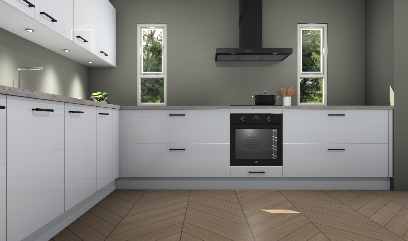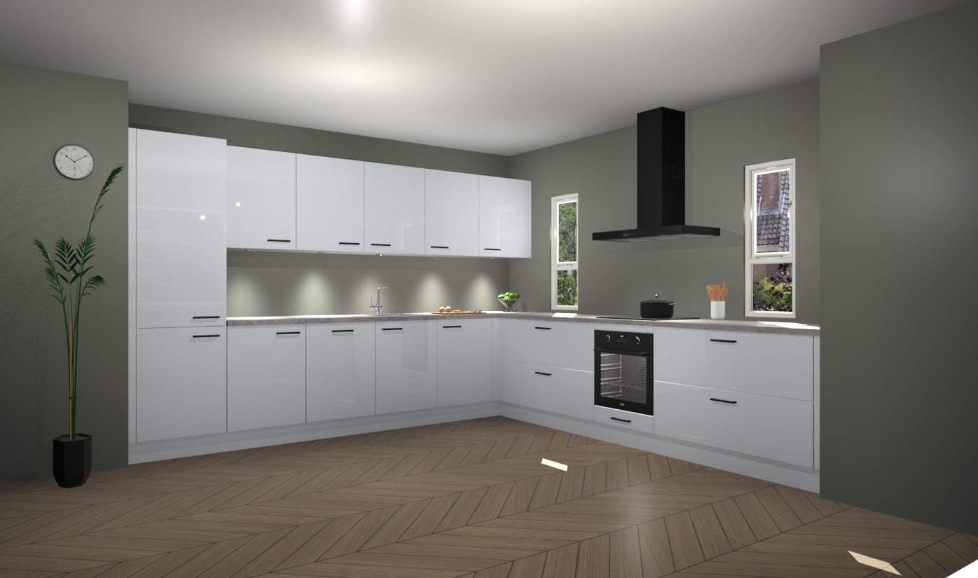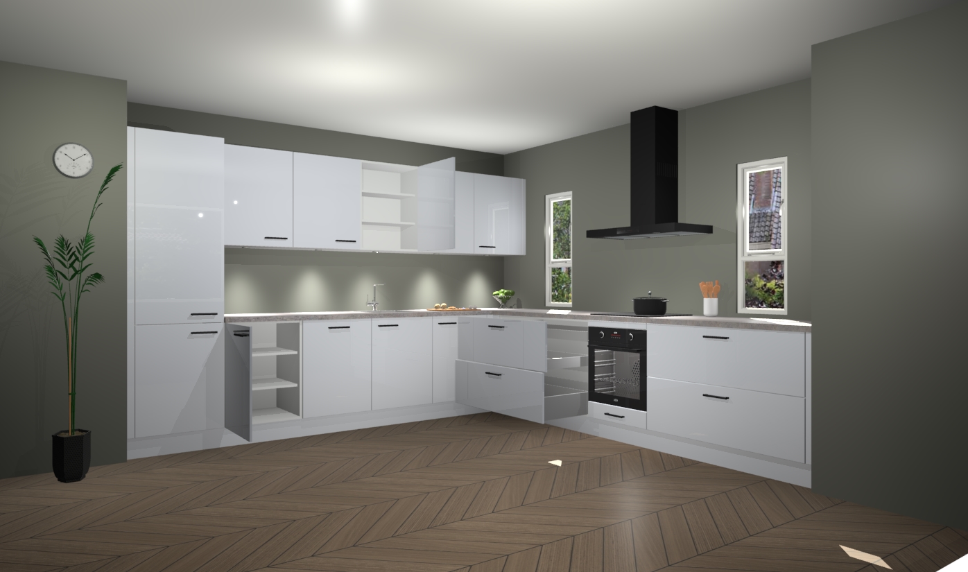De sneeuwwitte hoogglans keuken is een ideale hoekkeuken en heeft alle functies en apparatuur die u maar nodig kunt hebben. Bij de bestelling krijgt u een oven, inductiekookplaat, afzuigkap, vaatwasser en koelkast - deze kunnen desgewenst eenvoudig worden uitgebreid naar AEG na bestellen. Elke kast wordt ook voor gemonteerd geleverd met soft close deuren die jarenlang gebruik beloven. Stelt u zich voor dat u geen gedoe heeft met vervelende montage - vanaf het moment dat u uw bestelling plaats, duurt het slechts 7 weken voor het bij u thuis geleverd wordt.