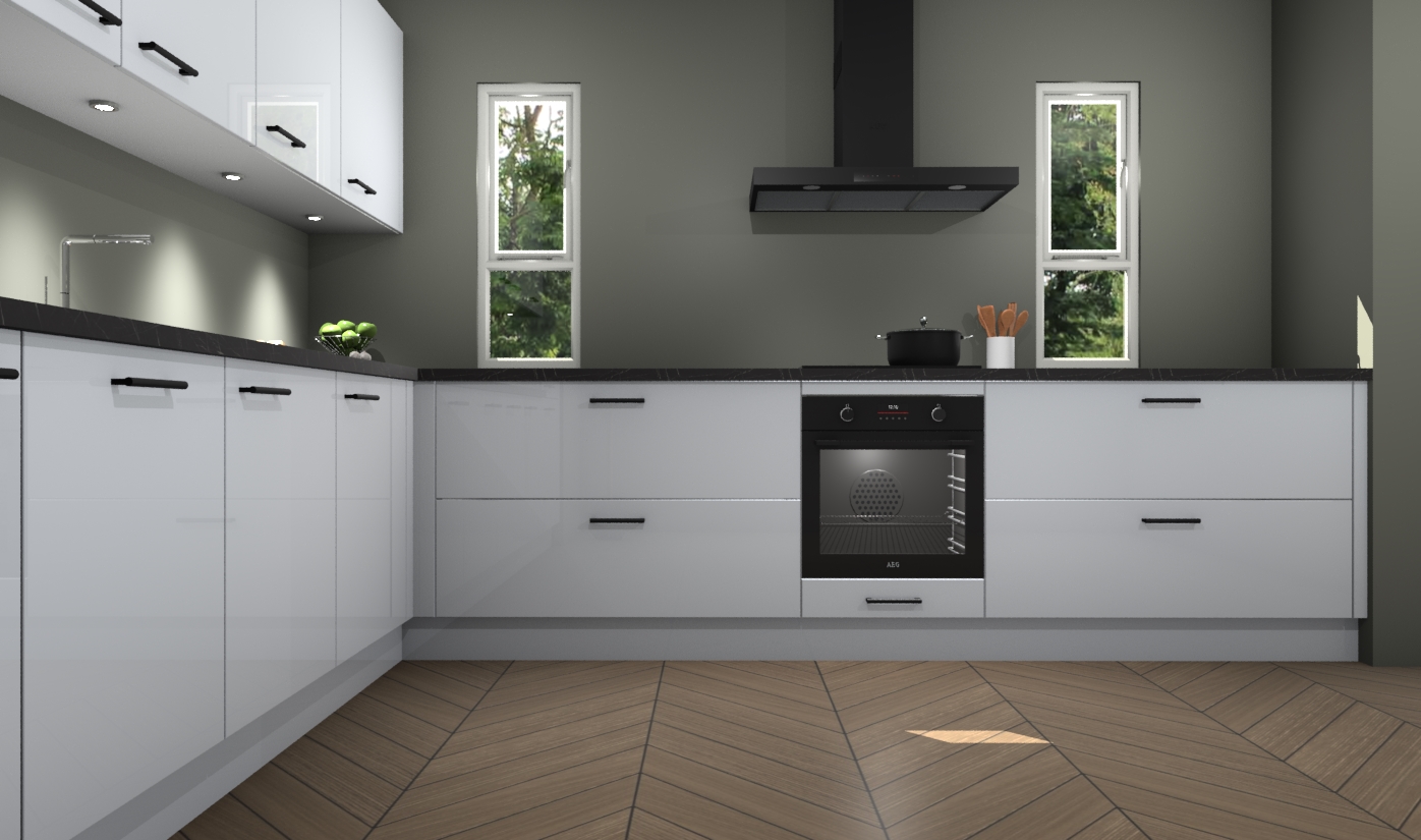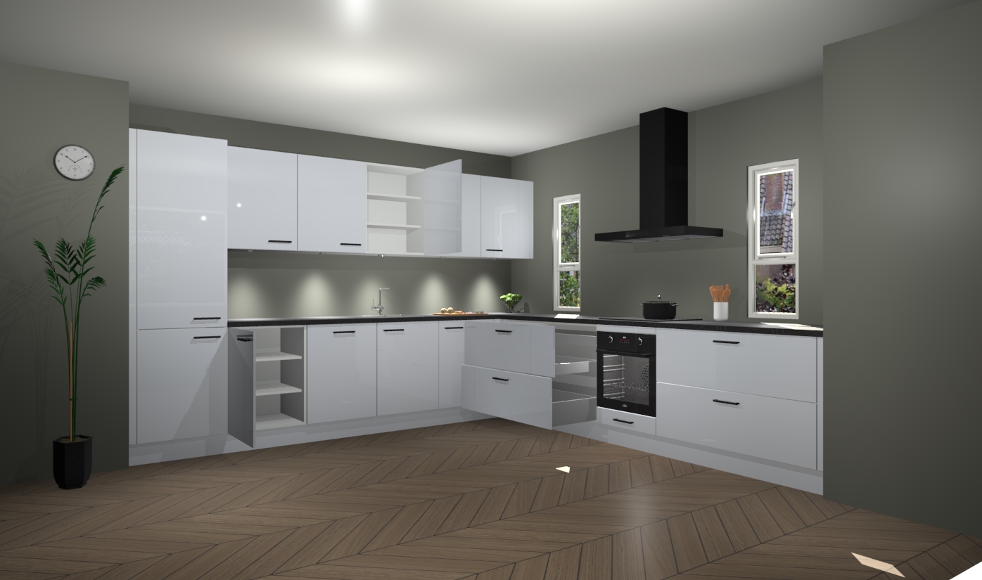 De sneeuwwitte hoogglans keuken is een ideale hoekkeuken en heeft alle functies en apparatuur die u maar nodig kunt hebben. Bij de bestelling krijgt u een oven, inductiekookplaat, afzuigkap, vaatwasser en koelkast - deze kunnen desgewenst eenvoudig worden uitgebreid naar AEG na bestellen. Elke kast wordt ook voor gemonteerd geleverd met soft close deuren die jarenlang gebruik beloven. Stelt u zich voor dat u geen gedoe heeft met vervelende montage - vanaf het moment dat u uw bestelling plaats, duurt het slechts 7 weken voor het bij u thuis geleverd wordt.