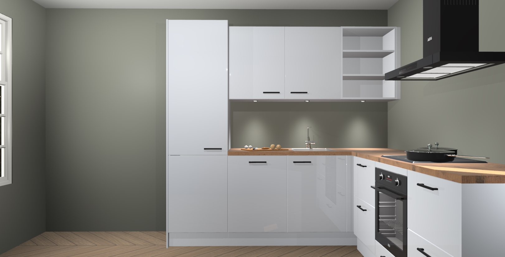 Met zijn moderne design en aantrekkelijke hoekopstelling biedt deze keuken een unieke look die zelfs de meest veeleisende huiseigenaar zal bevallen. En omdat de binnenkant van de kasten dezelfde kleur heeft als de buitenkant, heeft uw keuken een consistente afwerking. Bovenop de geweldige look is opbergruimte ook geen probleem, met voldoende kast- en laderuimte achter zelfs de mooiste buitenkant.