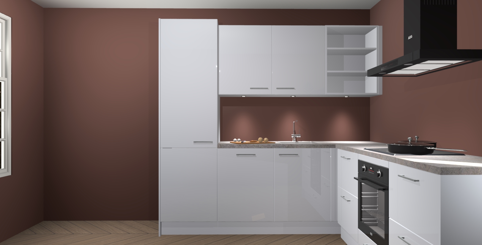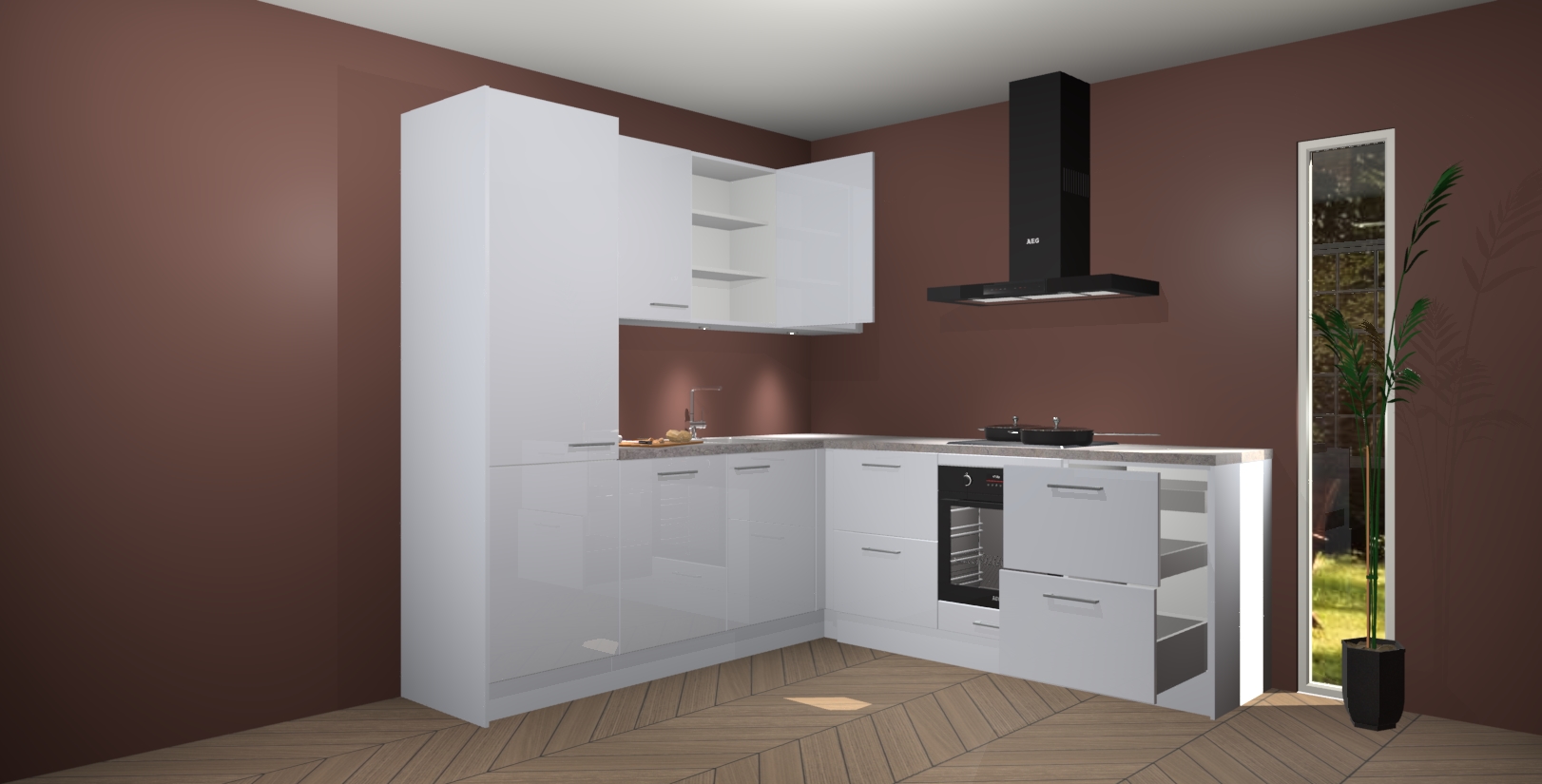 Met zijn moderne design en aantrekkelijke hoekopstelling biedt deze keuken een unieke look die zelfs de meest veeleisende huiseigenaar zal bevallen. En omdat de binnenkant van de kasten dezelfde kleur heeft als de buitenkant, heeft uw keuken een consistente afwerking. Bovenop de geweldige look is opbergruimte ook geen probleem, met voldoende kast- en laderuimte achter zelfs de mooiste buitenkant.