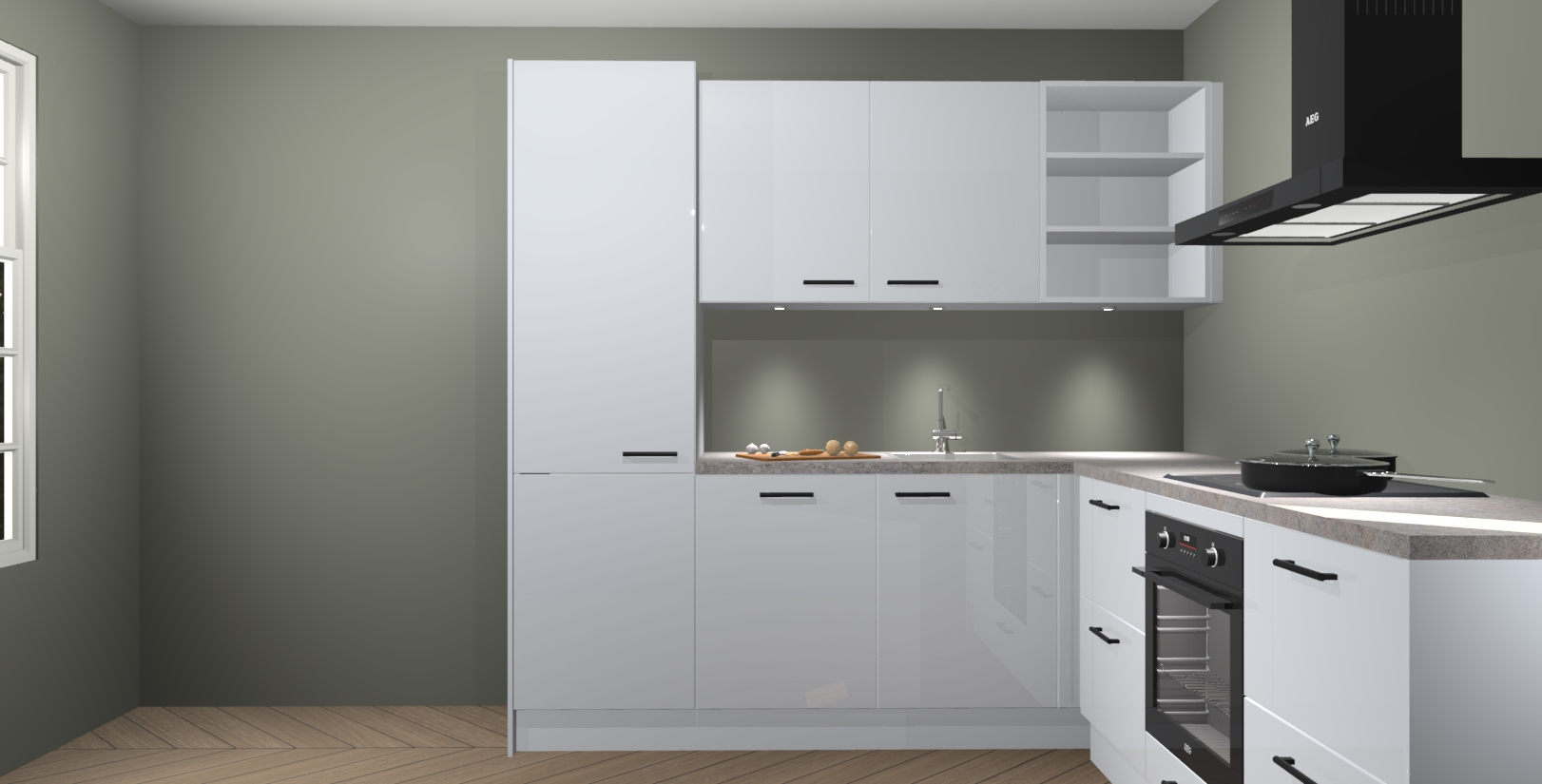 Met zijn moderne design en aantrekkelijke hoekopstelling biedt deze keuken een unieke look die zelfs de meest veeleisende huiseigenaar zal bevallen. En omdat de binnenkant van de kasten dezelfde kleur heeft als de buitenkant, heeft uw keuken een consistente afwerking. Bovenop de geweldige look is opbergruimte ook geen probleem, met voldoende kast- en laderuimte achter zelfs de mooiste buitenkant.
