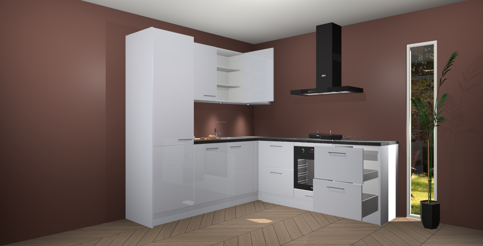Met zijn moderne design en aantrekkelijke hoekopstelling biedt deze keuken een unieke look die zelfs de meest veeleisende huiseigenaar zal bevallen. En omdat de binnenkant van de kasten dezelfde kleur heeft als de buitenkant, heeft uw keuken een consistente afwerking. Bovenop de geweldige look is opbergruimte ook geen probleem, met voldoende kast- en laderuimte achter zelfs de mooiste buitenkant.