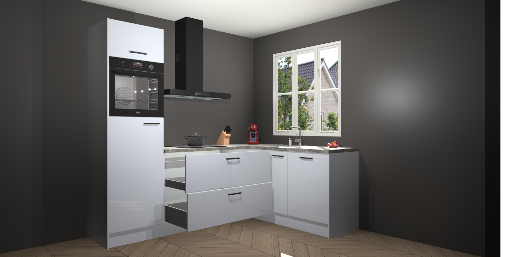 Dit model biedt u voldoende opbergruimte en vijf ingebouwde apparaten: een oven, inductiekookplaat, afzuigkap, vaatwasser en koelkast. Deze apparaten kunnen gemakkelijk worden geüpgrade naar AEG nadat u besteld heeft. De verschillende laden en kastjes bevatten softclose-deuren waardoor ze gezellig dichtvallen met een geruststellend helemaal geruisloos geluid. En dat is nog niet alles! We garanderen ook dat de prijs altijd laag blijft - dus haal nu uw Sneeuwwitte hoogglans keuken Victoria terwijl het kan.