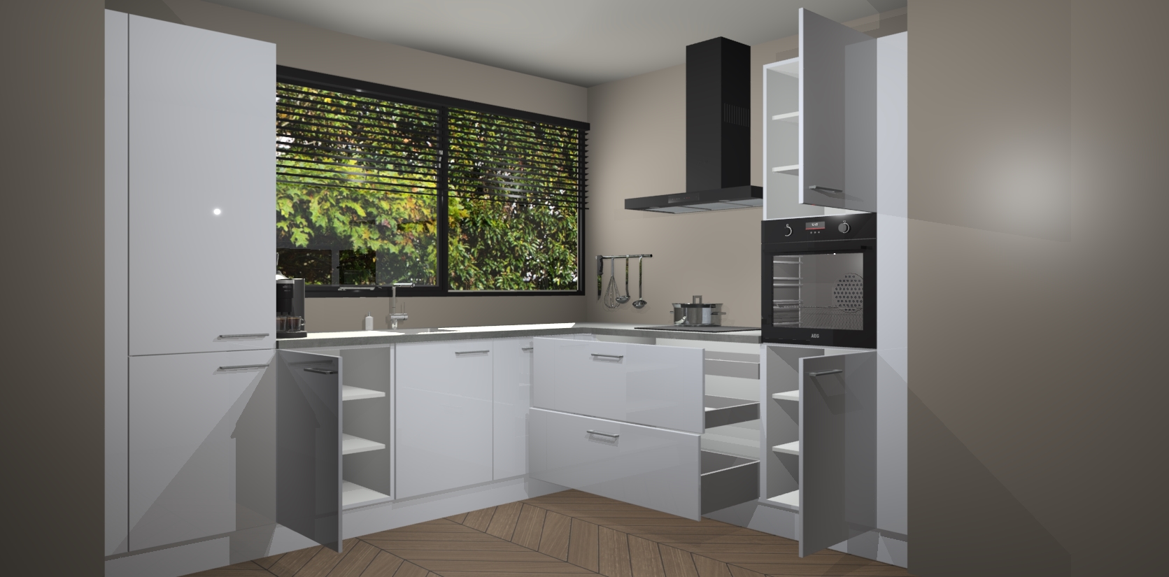 Met een modern, tijdloos design en ruime opslagruimte, zult u zich in no-time thuis voelen in uw nieuwe keuken. Uw leven wordt eenvoudiger met de soft-close deuren die voor het ultieme stille comfort zorgen - geen geluid dat u stoort terwijl u kookt. Ook is de keuken voorzien van 5 ingebouwde apparaten: een oven, inductie kookplaat, afzuigkap, vaatwasser en koelkast. Deze kunnen gemakkelijk na bestelling worden bijgewerkt naar AEG - waardoor uw luxe ervaring compleet is.