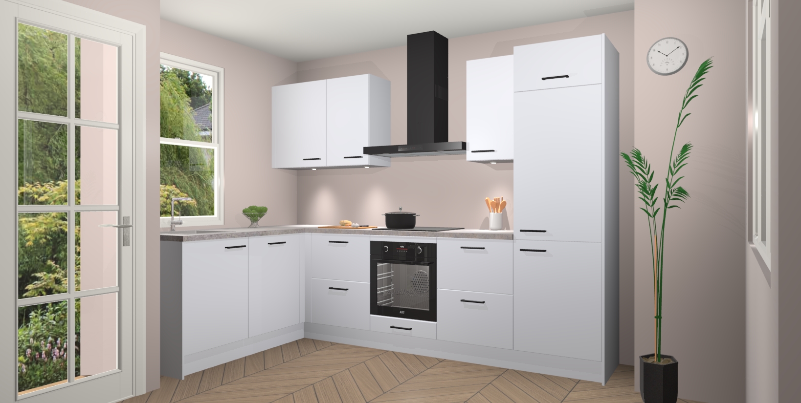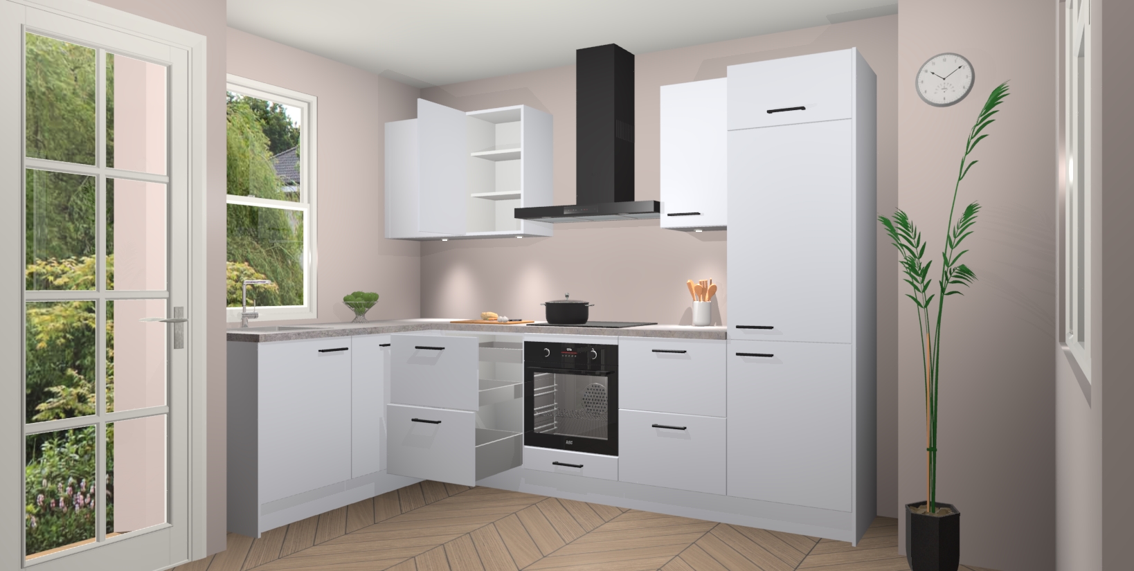 U hoeft zich ook geen zorgen te maken over een gebrek aan opbergruimte, want deze keuken heeft voldoende opbergmogelijkheden zowel boven als onder het aanrecht. Om het leven nog makkelijker te maken, wordt deze moderne hoekkeuken geleverd met 5 ingebouwde apparaten, waaronder een oven, inductiekookplaat, afzuigkap, vaatwasser en koelkast, zodat u in een mum van tijd klaar bent voor actie!