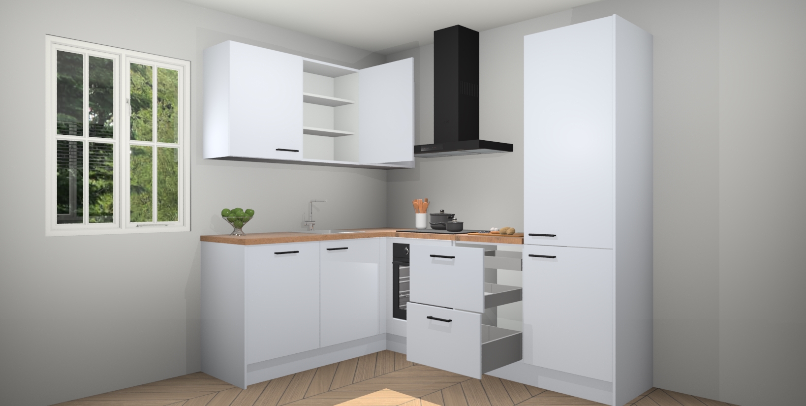 Voor nog meer gemak heeft deze keuken vijf ingebouwde apparaten - oven, inductiekookplaat, afzuigkap, vaatwasser en koelkast. Bovendien hebben alle kasten softclose deuren voor extra comfort bij het sluiten. Dit alles voor een verrassend lage vaste prijs - u vindt nergens anders een betere deal!