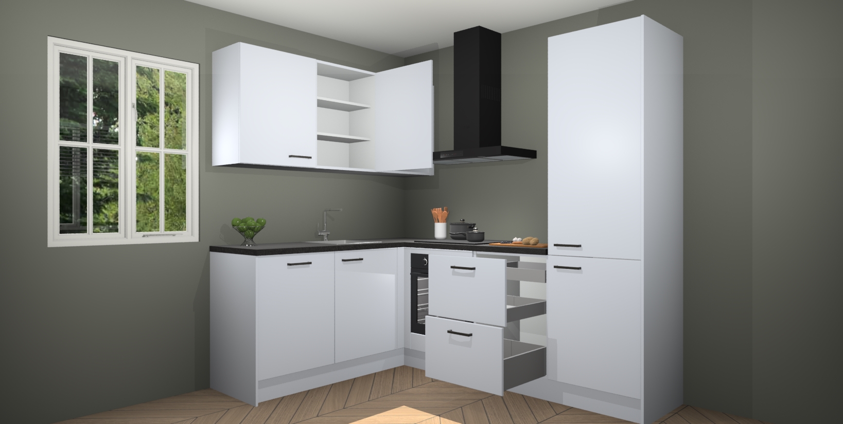 Voor nog meer gemak heeft deze keuken vijf ingebouwde apparaten - oven, inductiekookplaat, afzuigkap, vaatwasser en koelkast. Bovendien hebben alle kasten softclose deuren voor extra comfort bij het sluiten. Dit alles voor een verrassend lage vaste prijs - u vindt nergens anders een betere deal!
