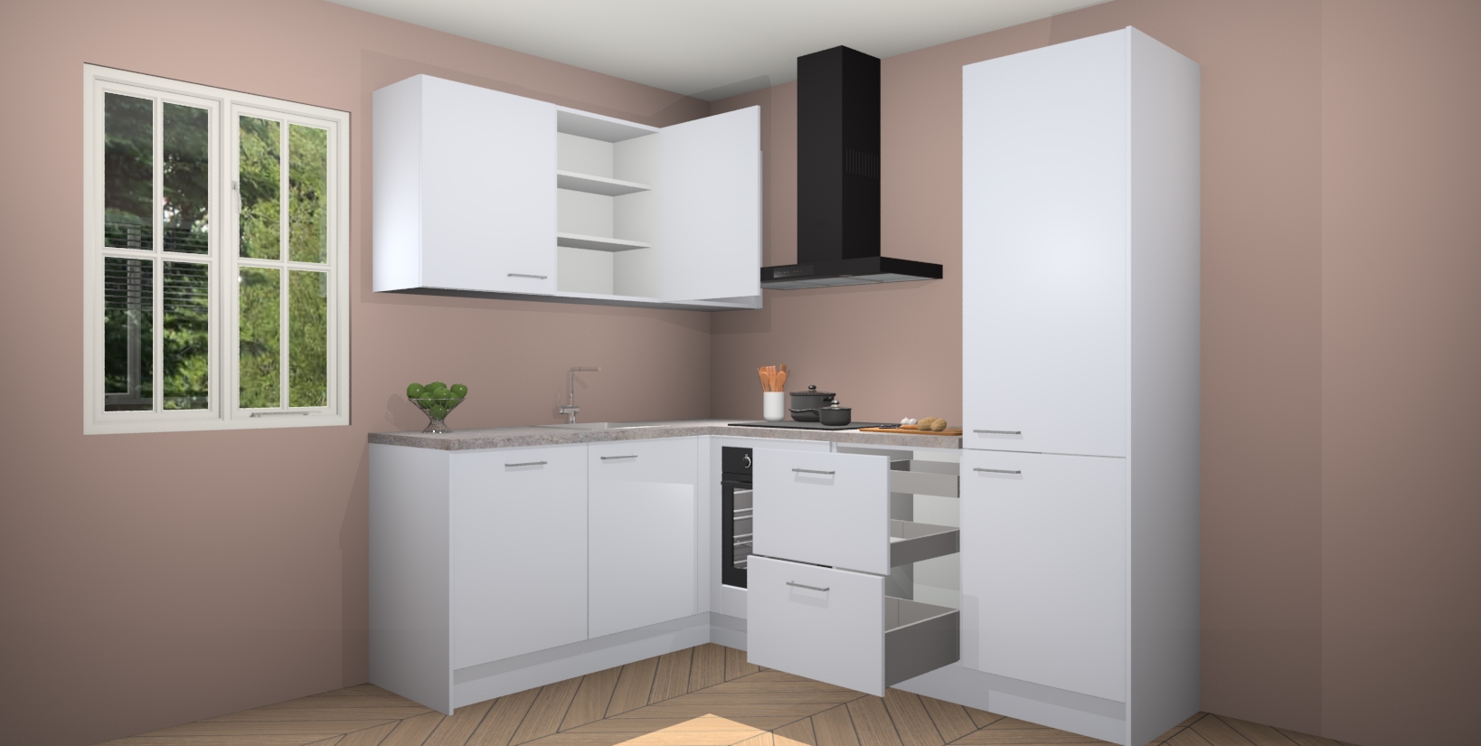 Voor nog meer gemak heeft deze keuken vijf ingebouwde apparaten - oven, inductiekookplaat, afzuigkap, vaatwasser en koelkast. Bovendien hebben alle kasten softclose deuren voor extra comfort bij het sluiten. Dit alles voor een verrassend lage vaste prijs - u vindt nergens anders een betere deal!