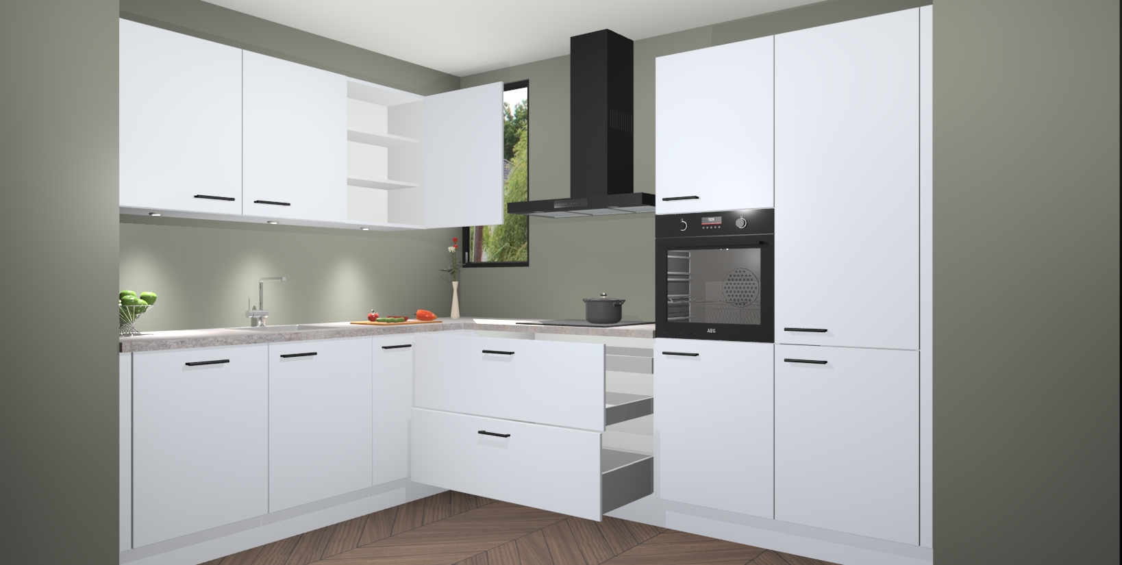 De ruime opbergruimte van dit model maakt het bereiden van voedsel en het gebruik van apparaten snel en gemakkelijk. Het beste van alles is dat het wordt geleverd met vijf inbouwapparaten: een oven, inductiekookplaat, afzuigkap, vaatwasser en koelkast - die allemaal gemakkelijk kunnen worden opgewaardeerd naar AEG na aankoop. Wat de gemaksfactor nog groter maakt, is het feit dat alle cabines voorgemonteerd worden geleverd, zodat u er meteen mee aan de slag kunt!